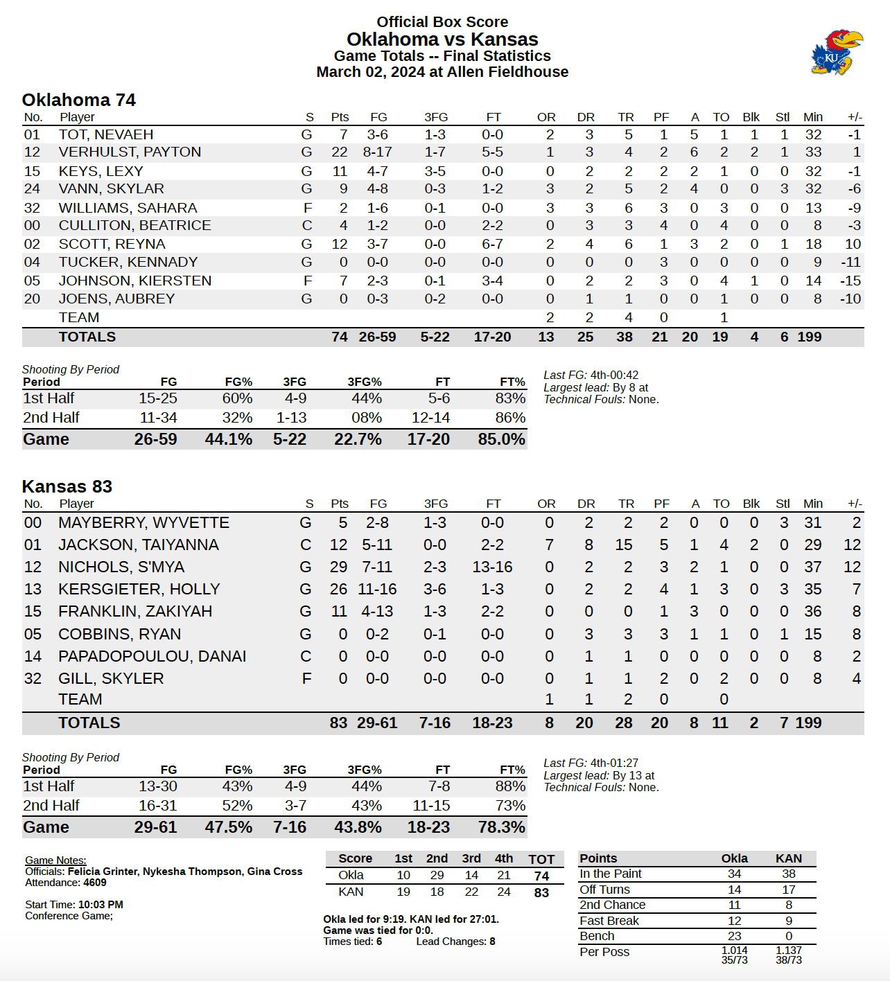 Superstar freshman S'Mya Nichols led the way with a career-high 29 points. Senior guard Holly Kersgieter, who ranks fifth on KU's all-time scoring list, added 26 points. And seniors Taiyanna Jackson (12 points, 15 rebounds), Zakiyah Franklin (11 points) and Ryan Cobbins and Wyvette Mayberry all contributed to the victory on both ends of the floor.