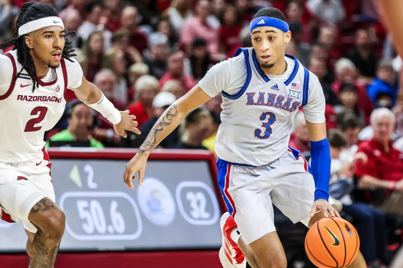 • Arkansas is a balanced offensive team, with six players averaging between 7.8 and 15.6 points per game this season. One concern of note for the Razorbacks is the fact that they’re expected to be without starting forward Adou Thiero, who averaged 15.6 points and 6.0 rebounds while shooting 55% from the floor this season. The Hogs aren’t known as a killer 3-point shooting team, making 33% for the season at 7.1 triples per game. And they were right around that number the first time they played the Jayhawks, hitting 6-of-24 from deep in the exhibition win. Twenty-three of their 85 points that night came at the free throw line and the Razorbacks forced KU into 17 turnovers, with 12 coming from Arkansas steals. Still, if you’re looking at weaknesses for this Kansas team, guarding the 3-point line has been one of them. Arkansas hit more than its average of 7 triples per game in 13 of 33 games this season, with the season-high being a 15-of-34 clip against UMES and their most efficient night coming in the road win at Kentucky, when they shot 13-of-25 from downtown. That game, back on February 1st, was the last time the Razorbacks reached double-digit 3-point makes in a game this season.