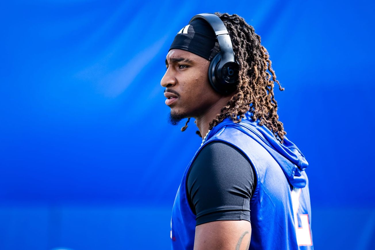 KU safety Lyrik Rawls warming up, with a scowl, before Saturday's Big 12 opening win over West Virginia at The Booth. [Kansas Athletics photo]