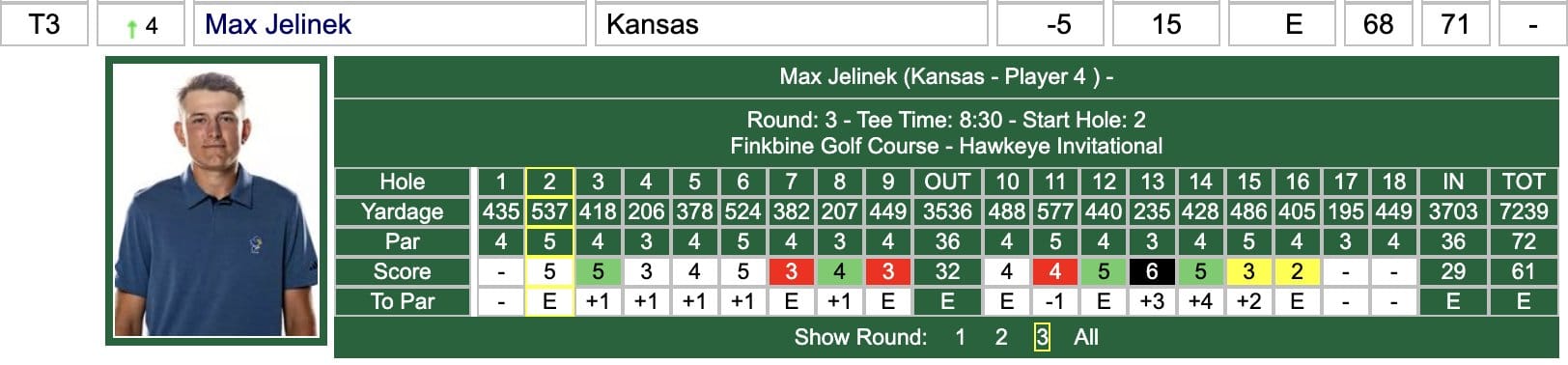 That was exactly what KU sophomore Max Jelinek recorded late in the final round of the Jayhawks’ team championship at the Hawkeye Invitational in Iowa City, Iowa on April 14.