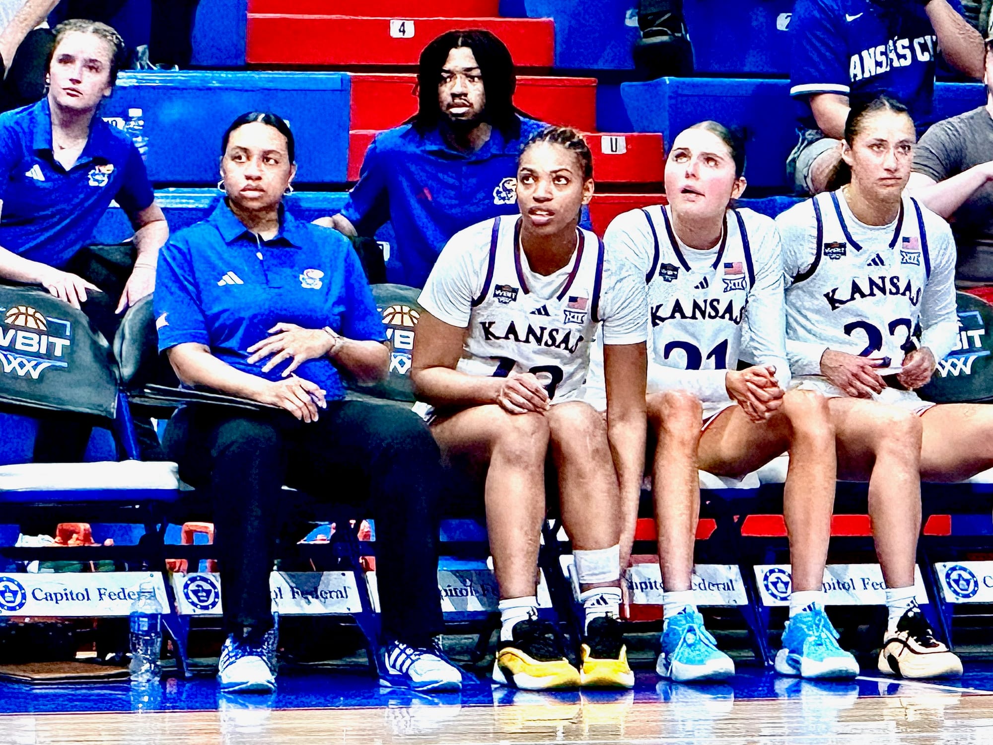 Nichols went down after twisting her ankle while landing on a camera person following a layup in front of the KU bench. She was in immediate agony and stayed there for some time. On the bench, as trainers looked at her ankle, took off her left shoe, taped and retaped the ankle and then tried to help her work through the pain, Nichols had severe discomfort plastered all over her face.