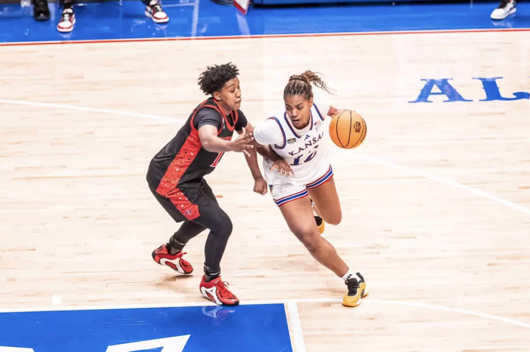S'Mya Nichols (yellow shoes) spent more time in the bench than she normally does on Thursday night, and her left ankle and its ability to hold up with the game on the line was a huge part of the story in the Jayhawks' latest win. [R1S1 Sports photos]
