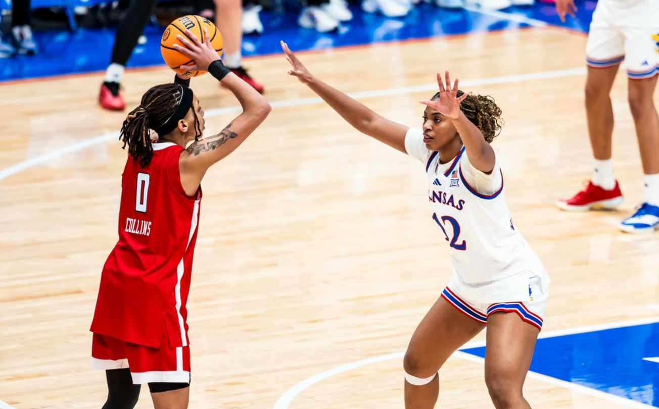 Senior Sania Copeland drew charges and played the kind of tough defense that matched Texas Tech’s style. Senior Elle Evans, who handled the ball well against the TTU press, buried a huge 3-pointer that started the Jayhawks’ takeover.