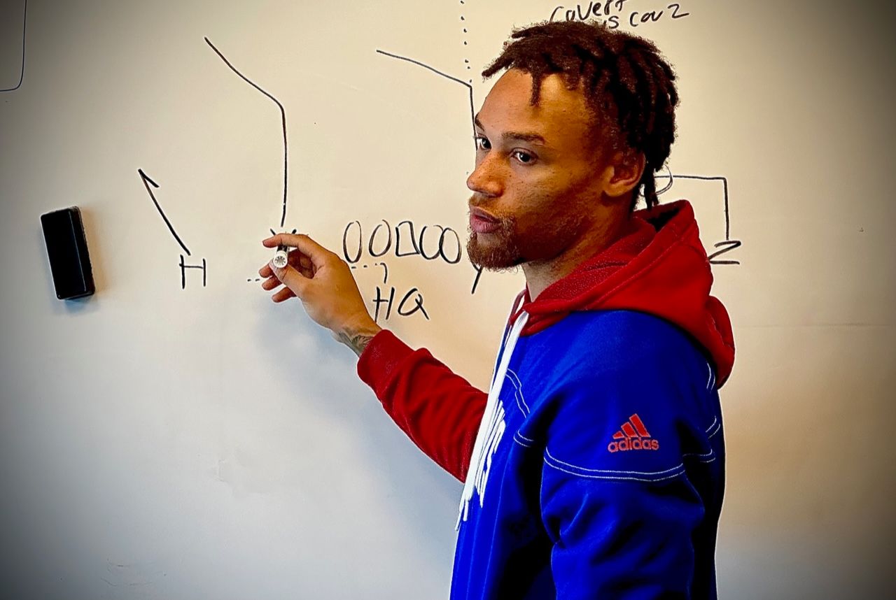 When Kansas wide receiver Quentin Skinner grabbed the black dry erase marker and stepped to the white board in Offensive Coodinator Andy Kotelnicki’s office, the room fell silent.