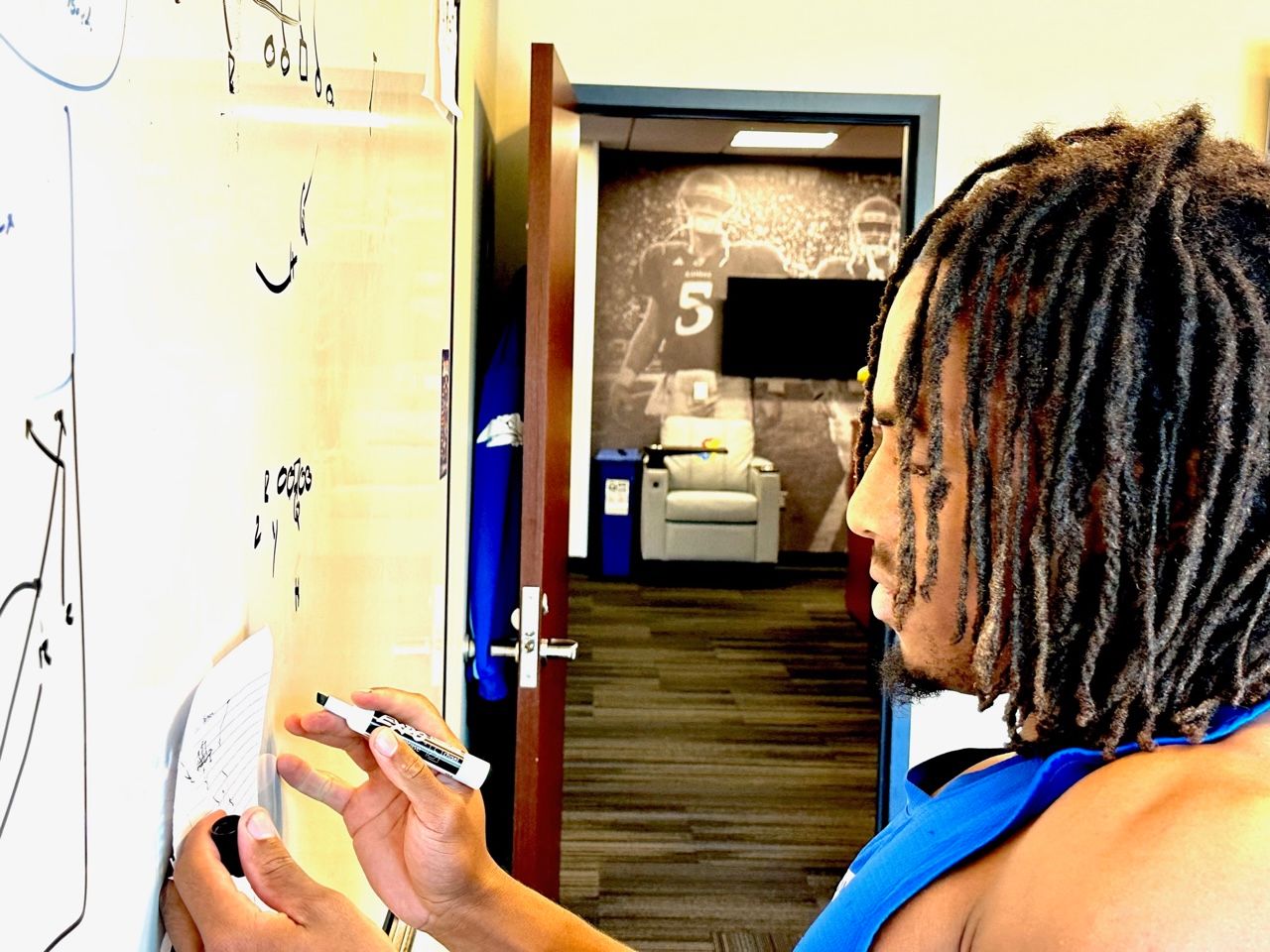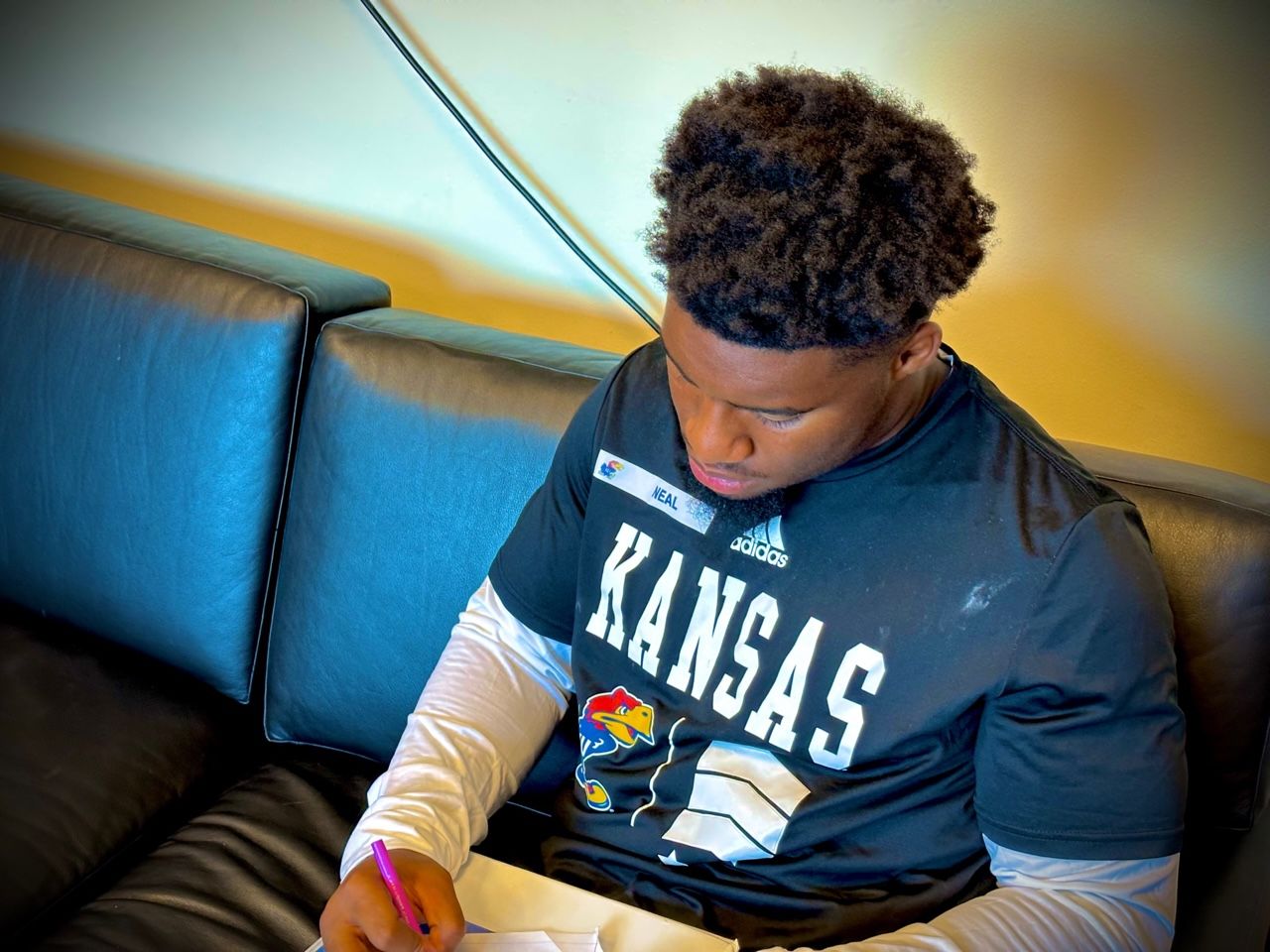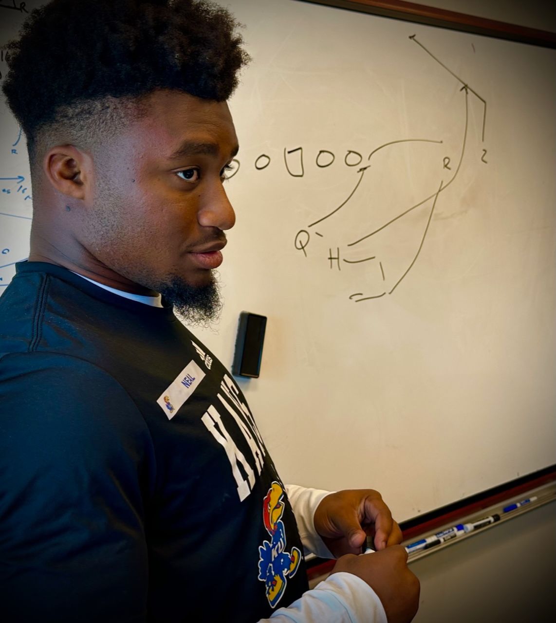 It was now Neal’s turn at the board. Although the KU running backs came up with several of their plays together, Neal was the first to draw, with McDuffie and Daniel Hishaw Jr. supporting him from the couches.