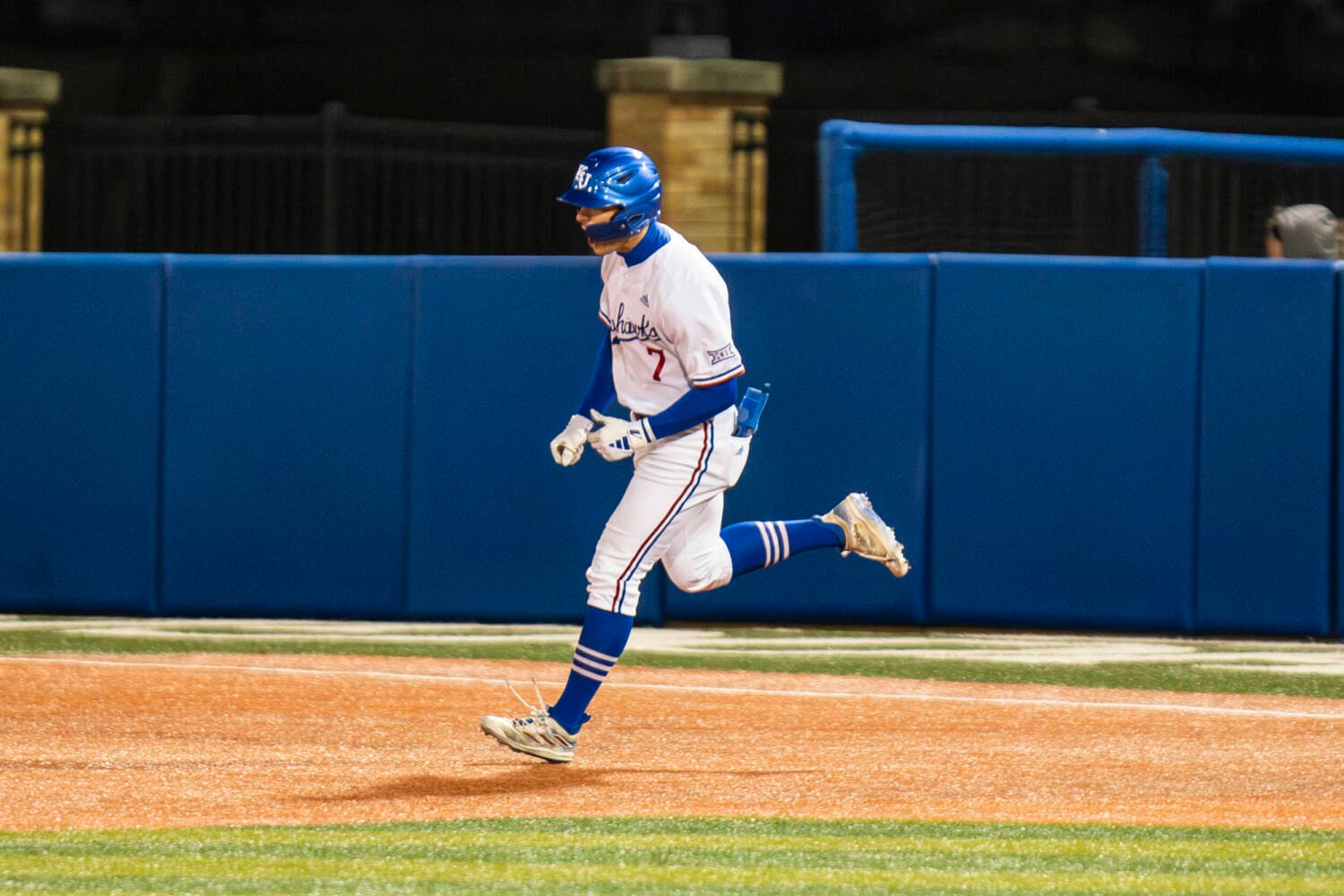 In the sixth, after launching a ball off the wall in right field, he slid head-first into third base content with a triple when the initial sign from KU’s third base coach was waving him home.