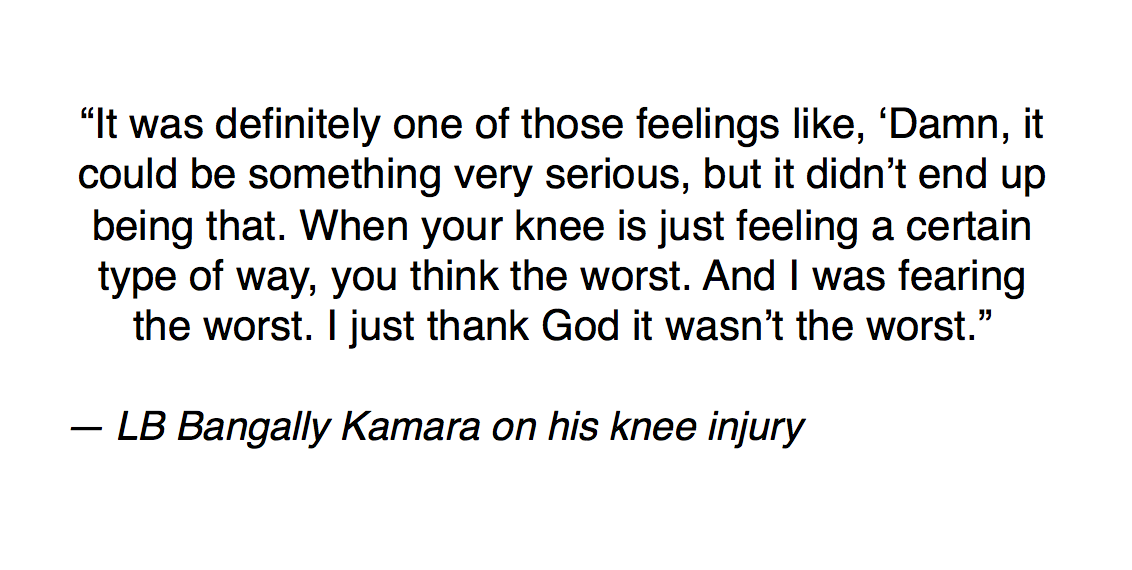 Kansas linebacker Bangally Kamara feared the worst when he injured his knee during a non-contact incident at a walk-through the week of the Wagner game.