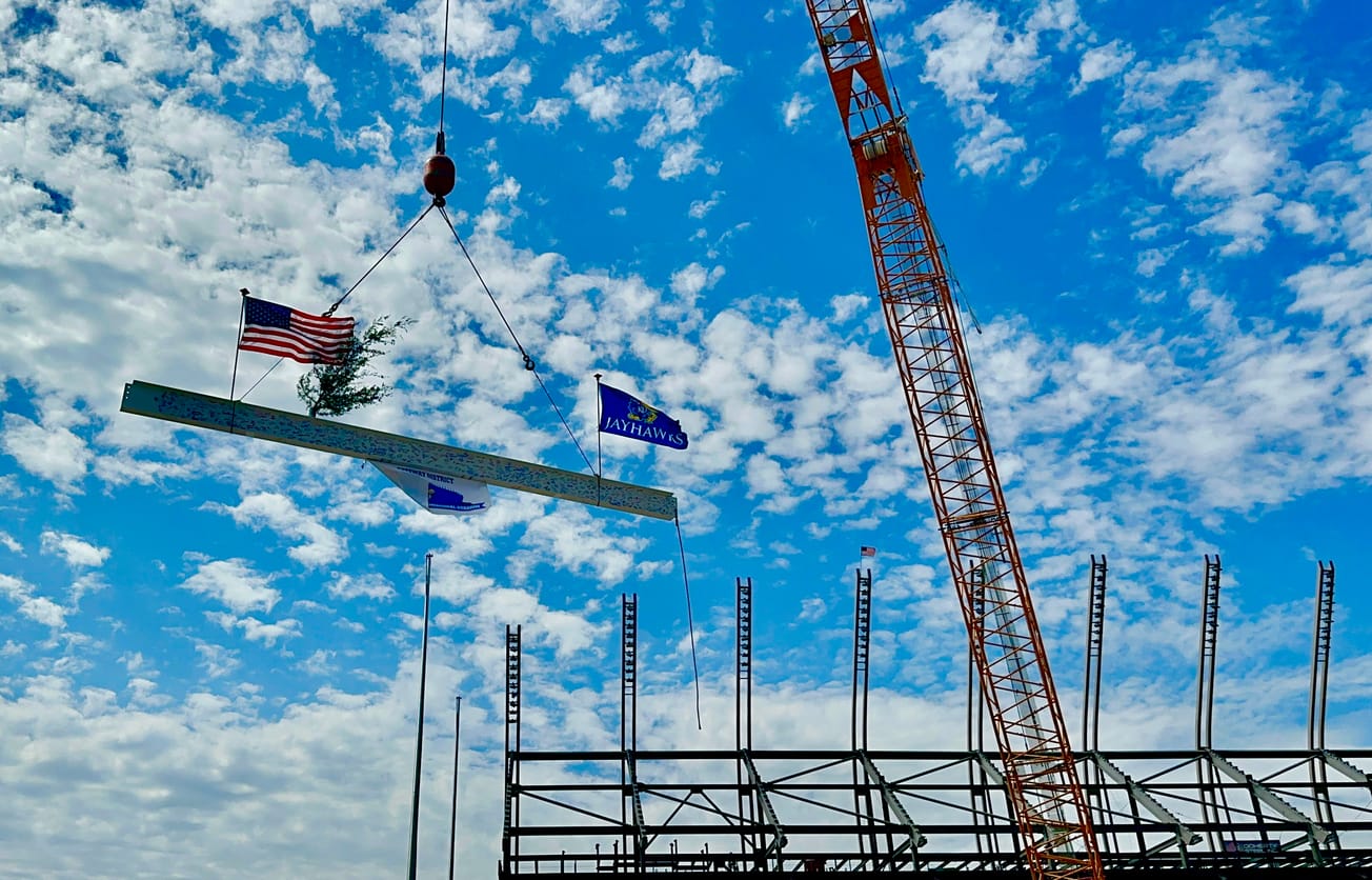 The beam, which was raised into the sky by a giant crane with an American flag on one end, a blue Kansas Jayhawks flag on the other and a small evergreen tree in the middle in sticking with the tradition of ushering in prosperity and good luck for the new venue, was the final piece of 6,500 pieces of steel that was used to build the frame of the new venue.