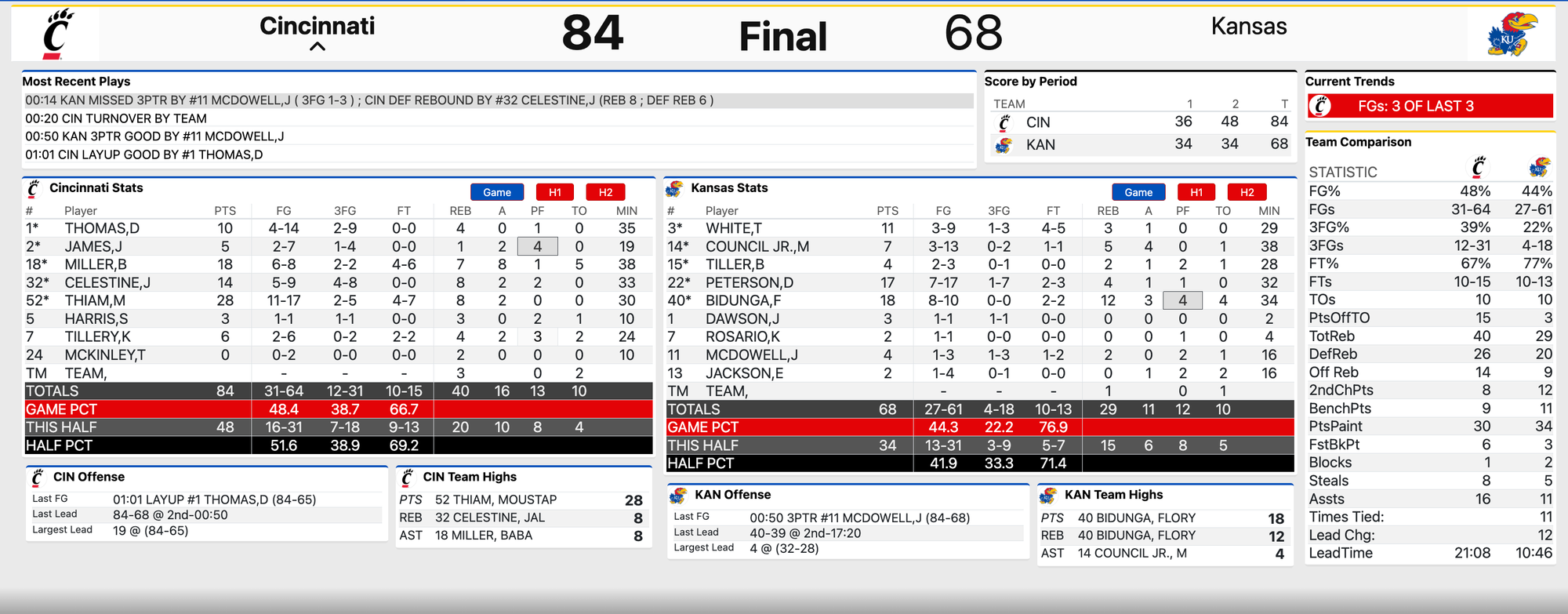 • 3-point D stunk - It's been hot and cold all season, but in this one, it was downright brutal. Not only did the Jayhawks allow 39% shooting (12-for-31) from 3-point range by the visitors, they barely contested more than half of those shots. Credit Cincy for good ball movement and a great game plan for some of that, but even when the Jayhawks were in position, their challenges were slow and lazy and did not affect the Cincinnati shooters even a little bit. Cincinnati made five triples in the first half and seven more in the second half. To compound the problem, KU made just 4-of-18 (22%) from 3-point range all day. Had they defended the arc better and made a few more, this one might've been up for grabs in the final minutes. Instead, it was merely Cincinnati adding to its highlights and relishing the win down the stretch.