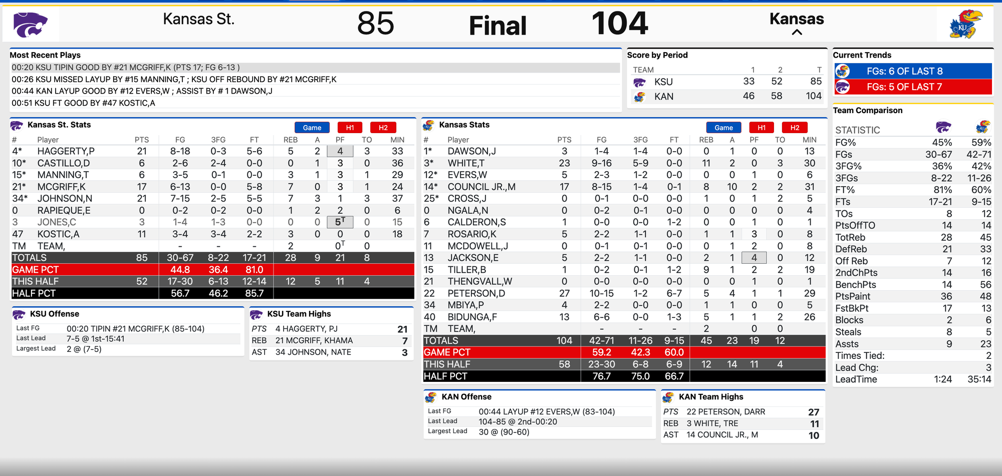 In the end, though, the Jayhawks had way too much in this Sunflower Showdown and rolled to an easy 104-85 victory at Allen Fieldhouse, marking the most points scored by a Kansas team in the in-state rivalry between these two.
