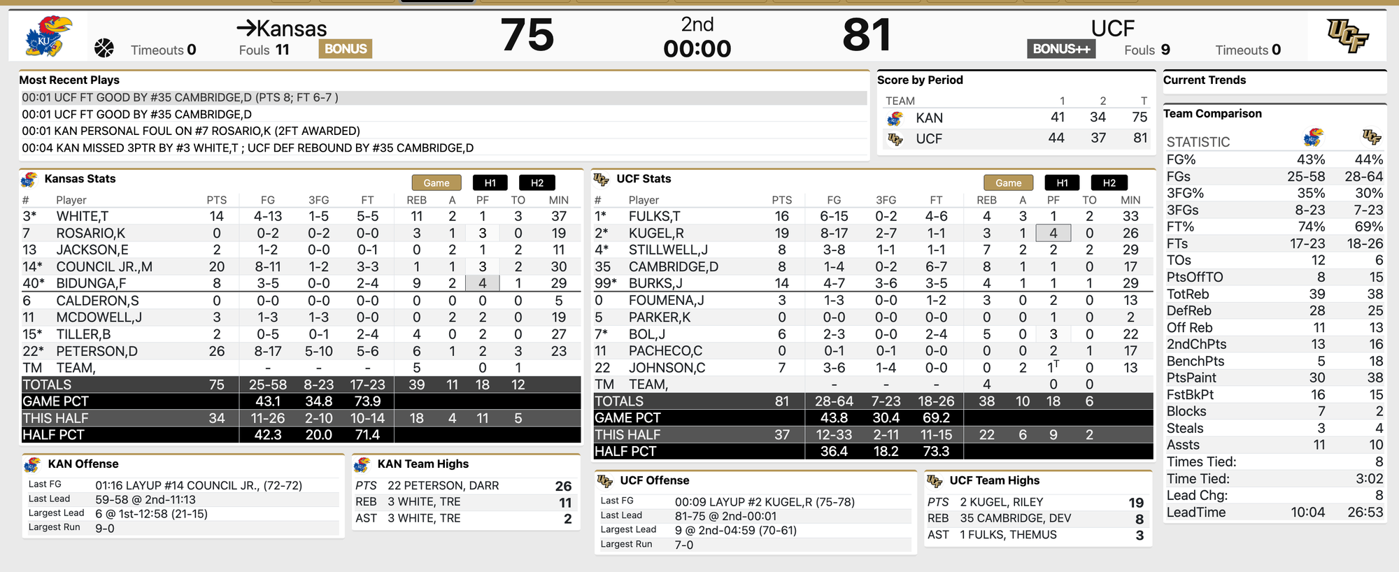 • Council's 2 fouls early - The first one was to prevent a basket in transition and was a pretty common foul. The second was an unnecessary reach that forced the KU point guard to go to the bench at the 16:06 mark of the first half. That second foul took him out of the first half from a mental standpoint and may have really hurt the Jayhawks' ability to take control of the game instead of allowing UCF to dictate pace, tempo and flow.