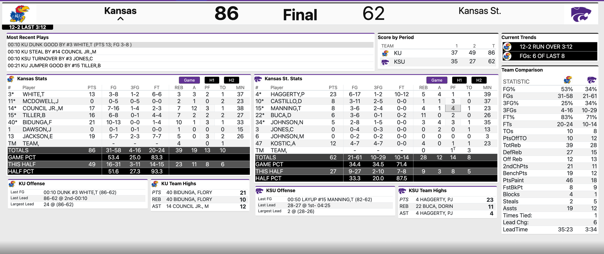 It wasn't perfect. It wasn't always pretty. But it wound up being pretty easy, and, by game's end at Bramlage Coliseum, the Jayhawks put an end to K-State's 3-game home-court winning streak with a convincing 86-62 win over the Wildcats.