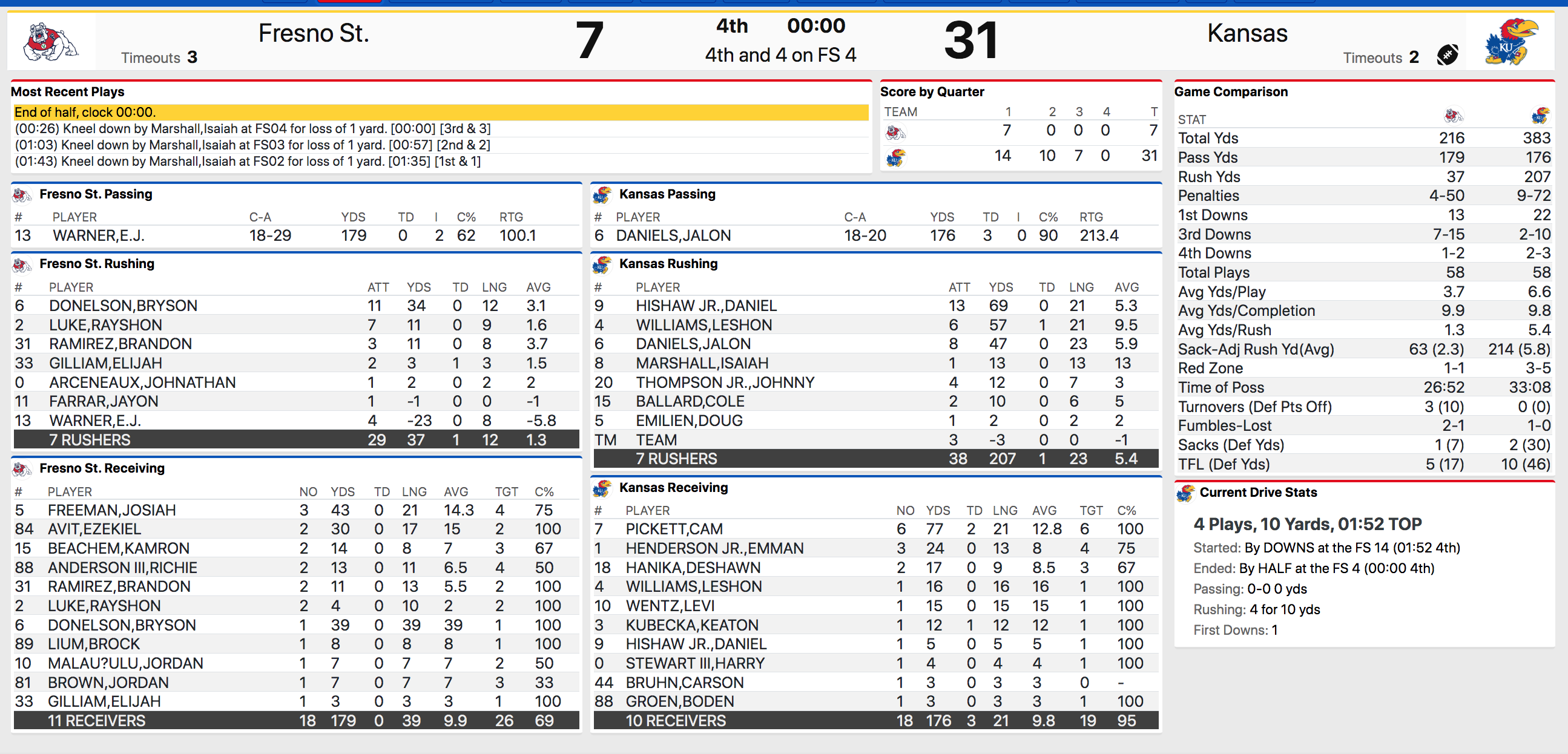 • 4th & 1 call early – It was a great decision to go for it on 4th and 1 in Fresno territory early on, and even better execution to pick it up. Rather than try some razzle-dazzle, the Jayhawks lined up in base offense and ran a power run set to Leshon Williams, who took the ball off the left guard and rumbled untouched into the end zone to put the Jayhawks up 14-7 and regain control for the home team. Williams had a nice debut with the Jayhawks, finishing with 57 yards and a 9.5 yards-per-carry clip on 6 carries.