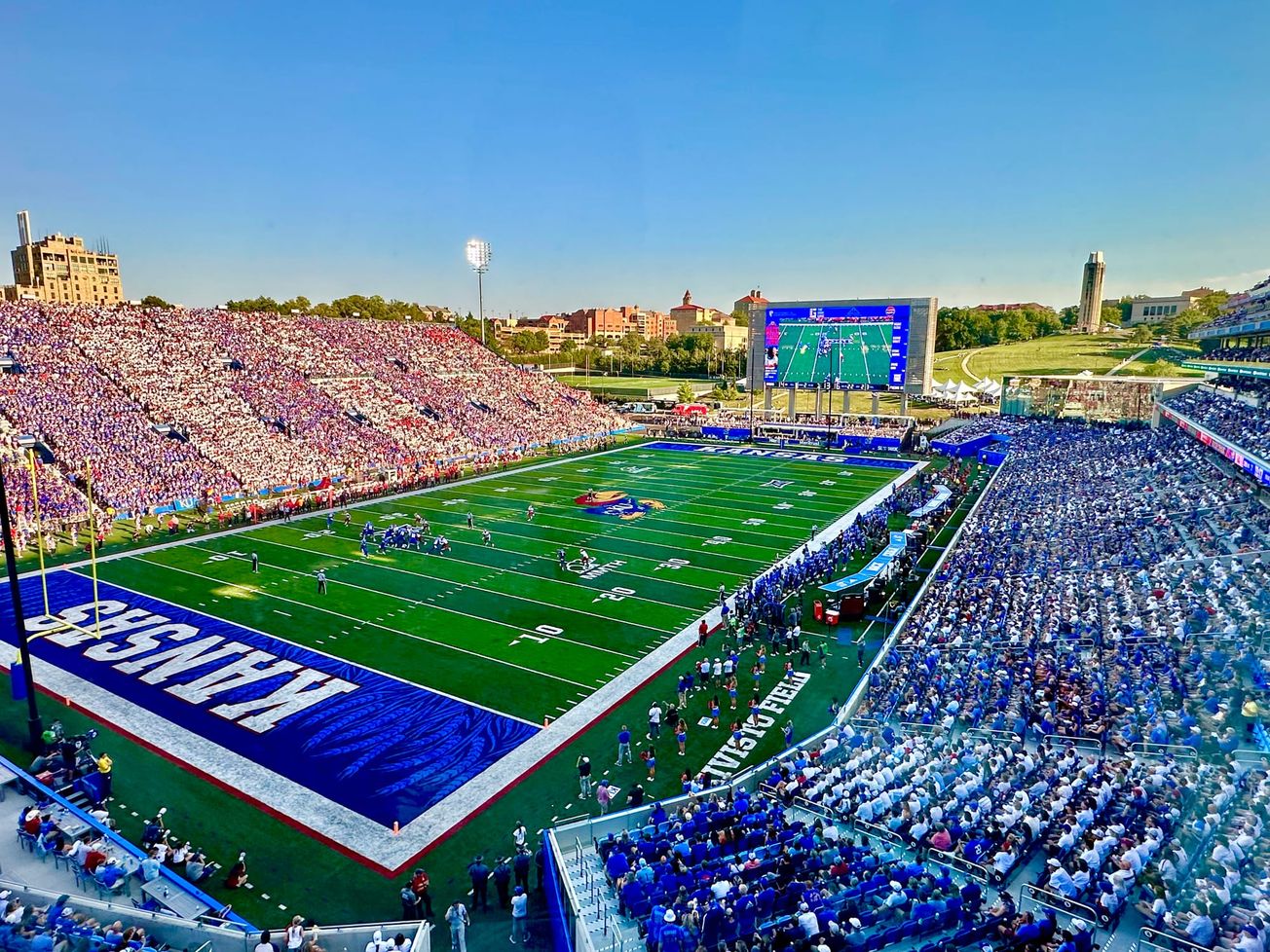 • Band in blue? – For the most part, Kansas Athletics’ efforts to host a “stripe out” in the opener, with every other section wearing white and blule. It looked pretty cool. Most people appeared to participate and the aesthetic in the stadium certainly popped. There was, however, one area that was curiously off – The second section of the student section in the northeast corner of the stadium. With the tiny first section decked out in blue shirts that were given to the students upon entry, the next section should’ve been white. And the top half of the section was in all white. Again, the give-away shirts handed out at entry. The bottom half of the section, which is where the band sits, was all blue, with the KU marching band wearing blue shirts and red hats for the opener. All in all, it was pretty harmless and didn’t do much to negate the cool look of the stripe-out promotion. It was just a bit surprising that the band didn’t play along.