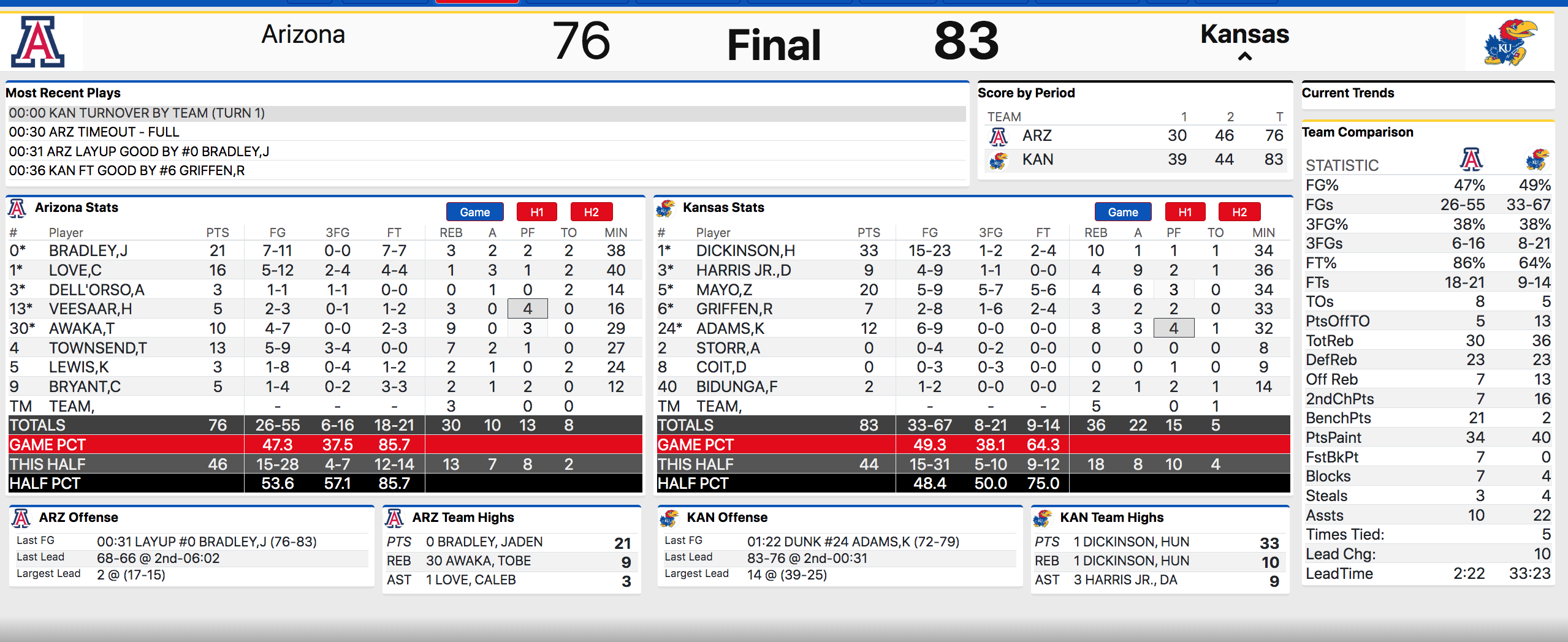 • Not getting back after makes – Arizona plays fast and can be a handful to keep up with. But there’s very little excuse for not getting back after made baskets, when the Wildcats have to take the ball out of bounds. The Jayhawks were burned by that a couple of times on Saturday, the most notable one coming after KU took a 58-57 lead and quickly gave up a dunk just seconds later after Arizona’s Tobe Awaka beat everybody down the floor for the uncontested two.