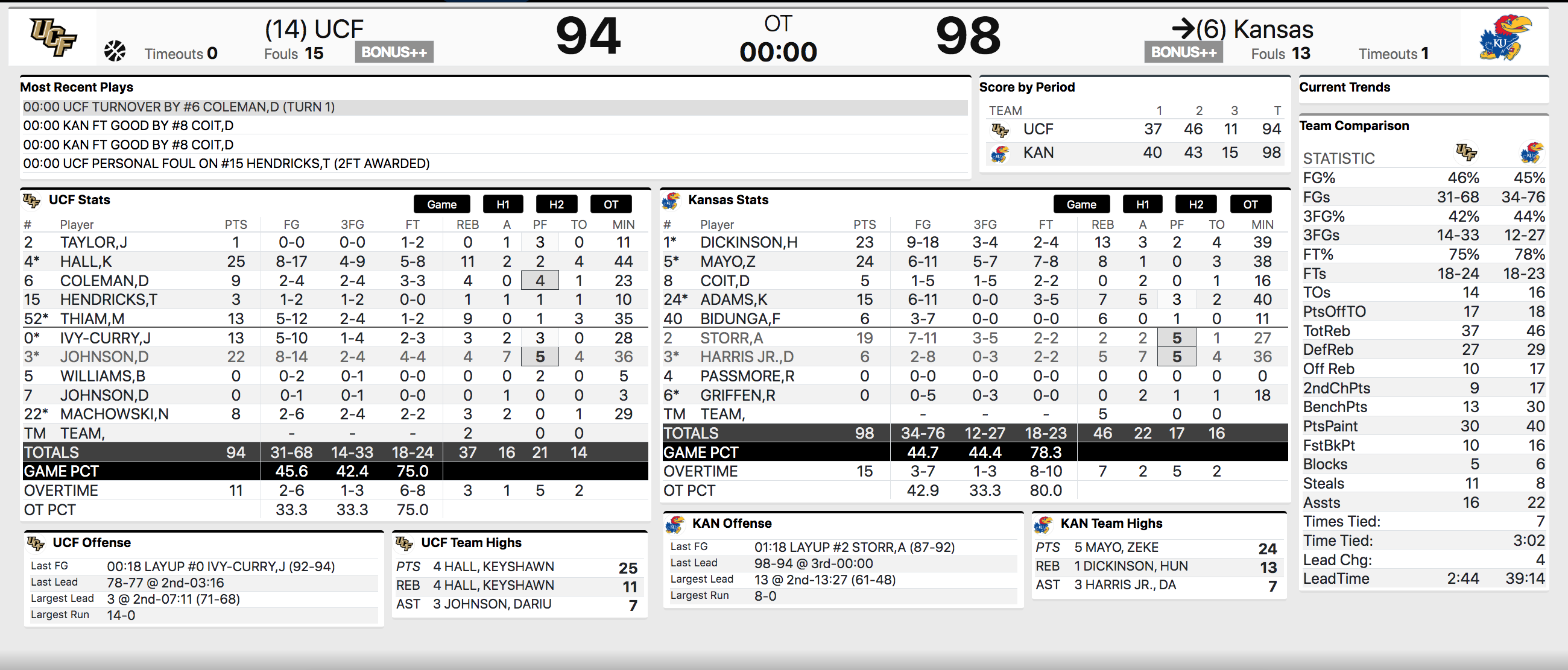 • Hunter’s quiet night… to start – UCF’s pretty long and athletic and runs a lot of bodies through the front court. So, there’s at least a reason behind the way he was neutralized during this one. But it was particularly quiet in the first half, when Dickinson was 1-for-5 from the floor for just 3 points, 5 rebounds and 2 turnovers in 16 minutes. This, after KU’s double-double machine was dominant in his last game against Arizona, tying a career-high with 33 points in that one. Dickinson opened the second half with much greater energy and effort, scoring in tight on a couple of early possessions and playing with a little more bounce in his step, on both ends, throughout most of the second half. UCF never let him get fully comfortable, though, and that clearly affected Kansas for much of the night. Dickinson did get hot from 3 in the second half and, believe it or not, managed to finish with 23 points and 13 rebounds, nearly all of it coming in the second half and overtime.