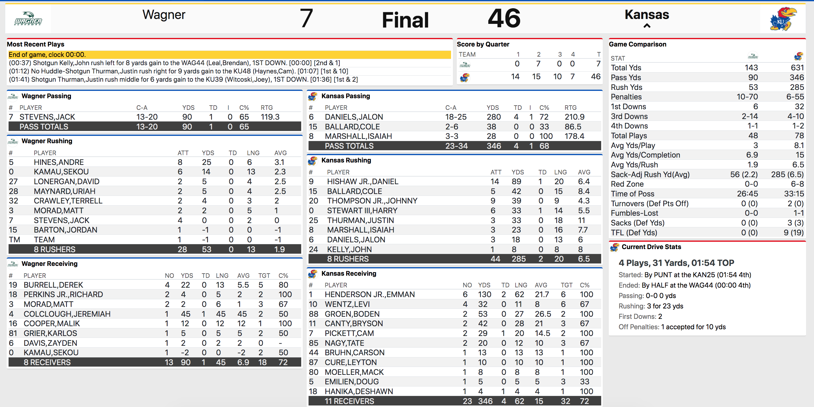 • That first defensive series – After Wagner won the coin toss and elected to receive the opening kick, the KU defense did exactly what you would expect the defense of a team that is favored by 46.5 points to do. Forcing a three-and-out was only part of the equation. They physically overpowered Wagner’s offense at every spot, on every play and in convincing fashion.