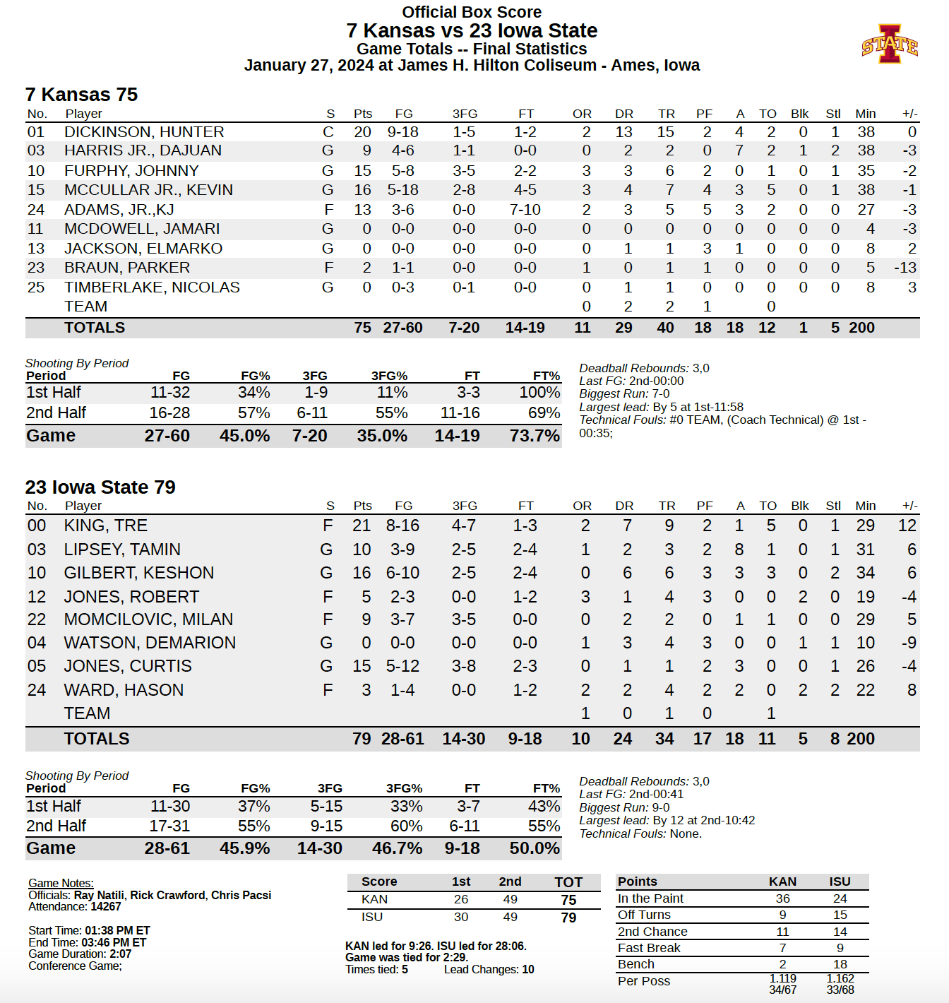 KU was able to cut the ISU lead all the way down to two points in the final 2 minutes — with a blend of heart, heroics and all-out effort — but the Jayhawks could not erase the lead and came out on the wrong end of a couple of crucial possessions late, none bigger than a shot-clock-beating 3-pointer by Keshon Gilbert that put ISU up 77-72.