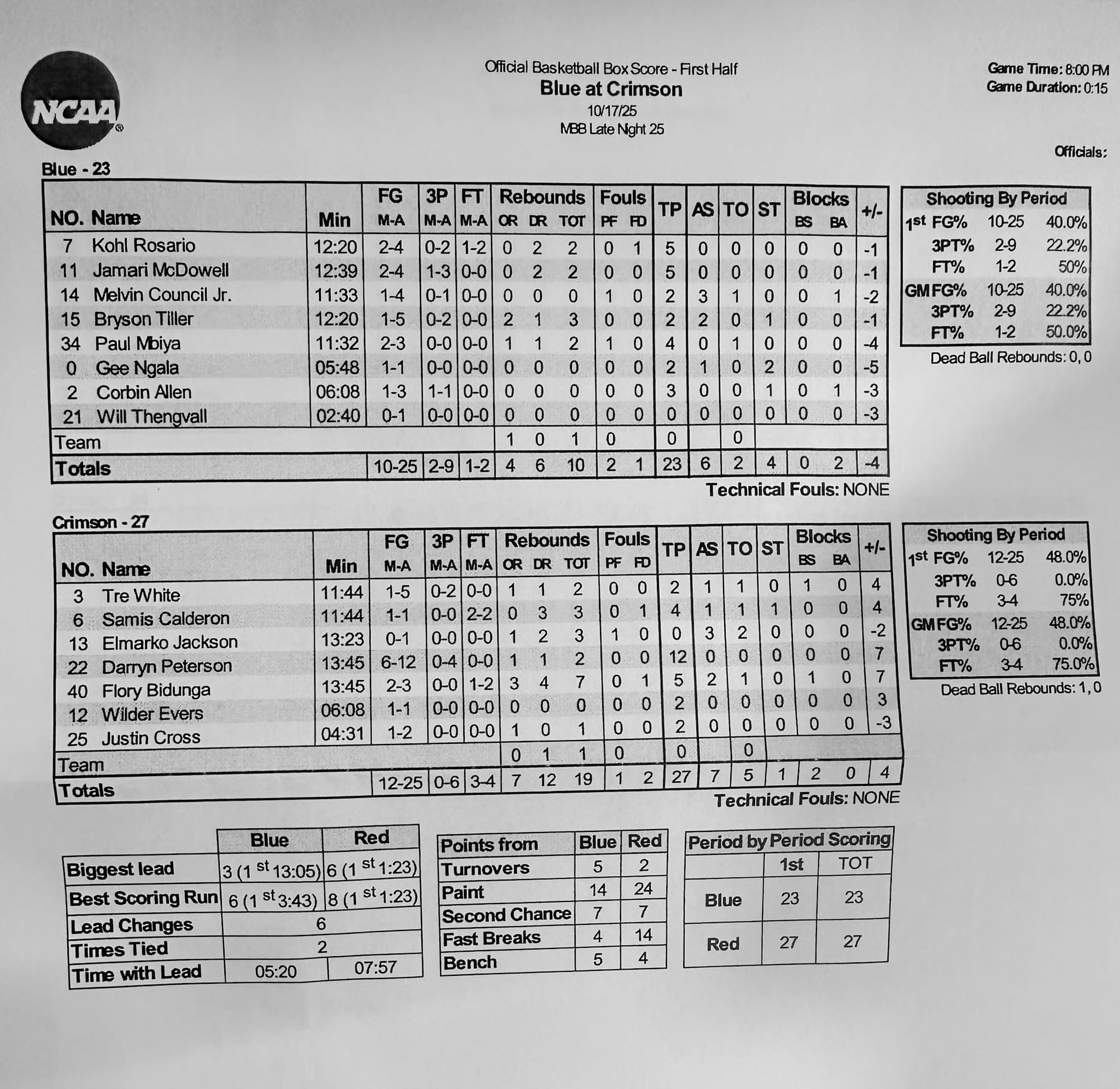 As expected, Peterson was the show during the men's scrimmage, making (6) and taking (12) more shots than any other player on his way to a 12-point night. The scoring after that was mostly balanced with three players scoring 5 points, two more scoring 4 points and the rest filling in with a bucket apiece after that.