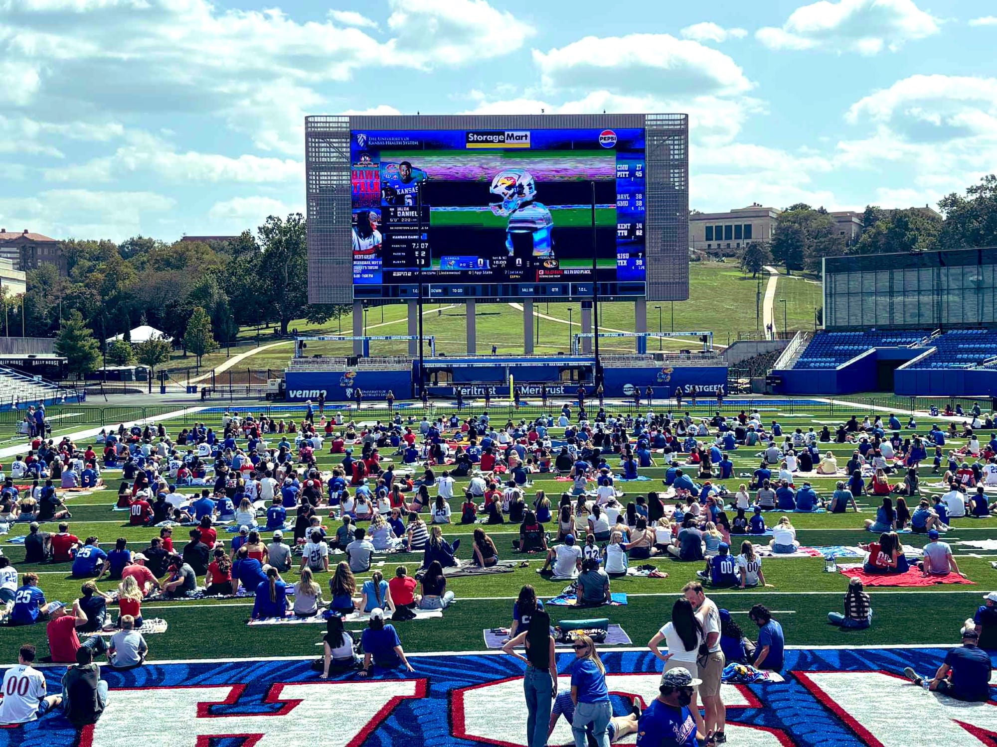 • Watch party back home – While a solid number of Kansas fans made the trek over to Columbia for this one, quite a few more stayed back home to attend a watch party at the new Booth on a gorgeous day. Admission was free and the fans were able to tour the stadium on their own and sit on the field to watch the game on the massive and crystal-clear brand-new video board. Several thousand fans turned out for the event to cheer on their Jayhawks on a beautiful Saturday for football.