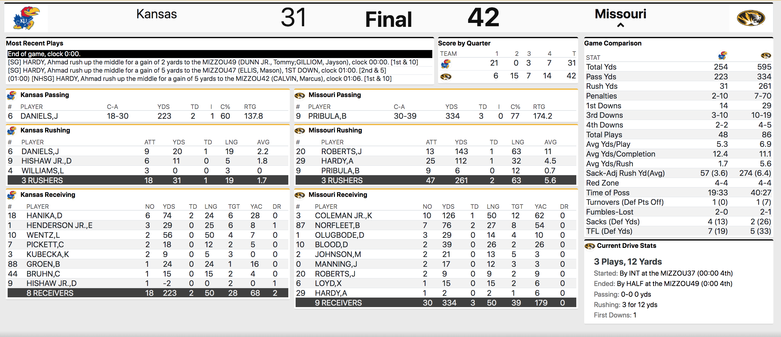 KU (2-1) went ahead with 8:45 to play and had two chances to stop the Tigers. But Mizzou (2-0) delivered twice, first on a 4th-down touchdown from 27 yards out to regain the lead (35-31) and then by putting the nail in the coffin with a 63-yard TD run following a KU decision to punt the ball away with 2:45 to play instead of trying to extend a potential game-winning drive with its offense.
