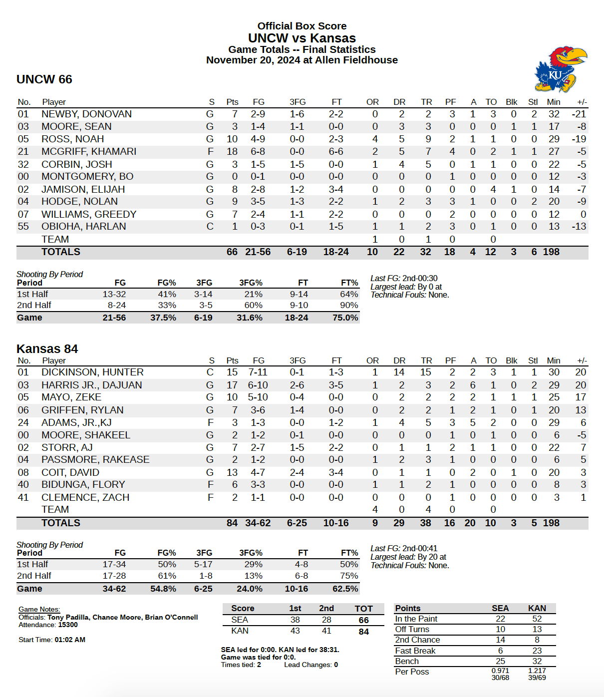After leading by just five at the break (43-38), KU outscored UNCW 41-28 in the second half to cruise to victory.