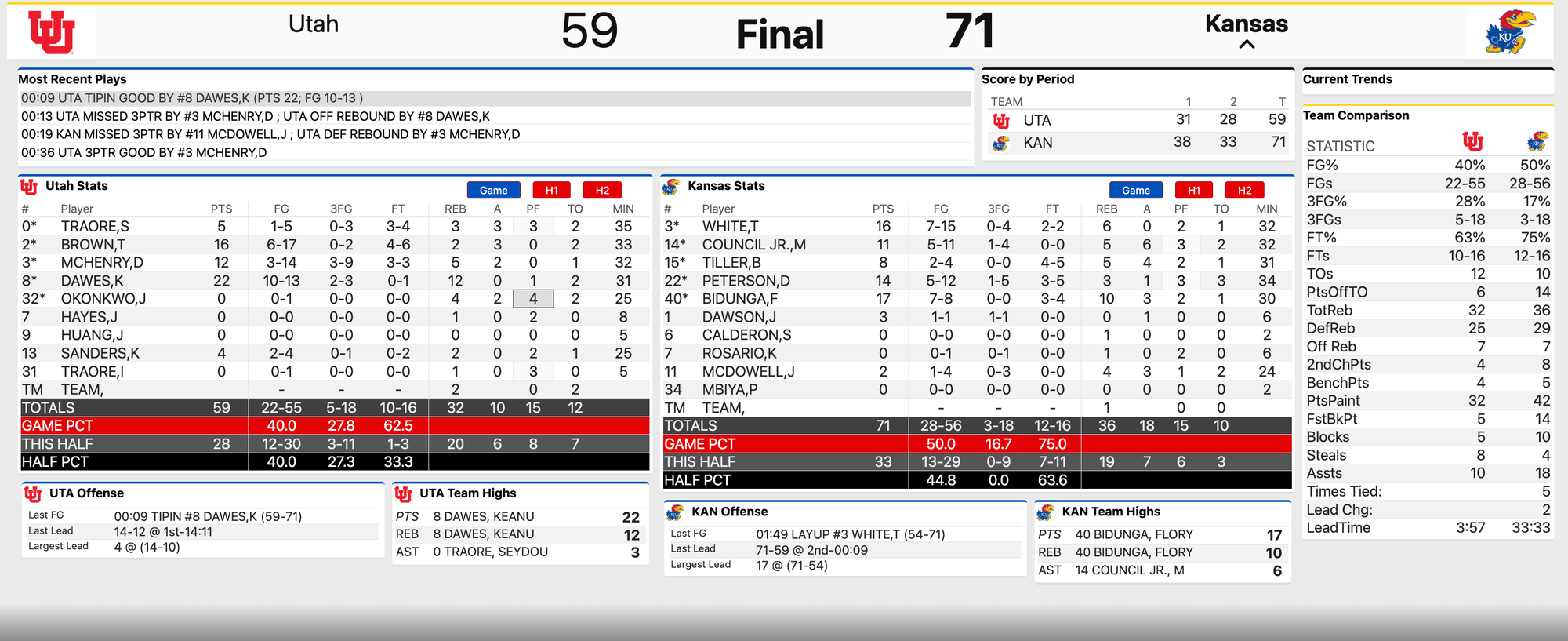 Utah showed some fight in the first couple of minutes of the second half, but the Jayhawks responded by regaining control and then cruised from there.