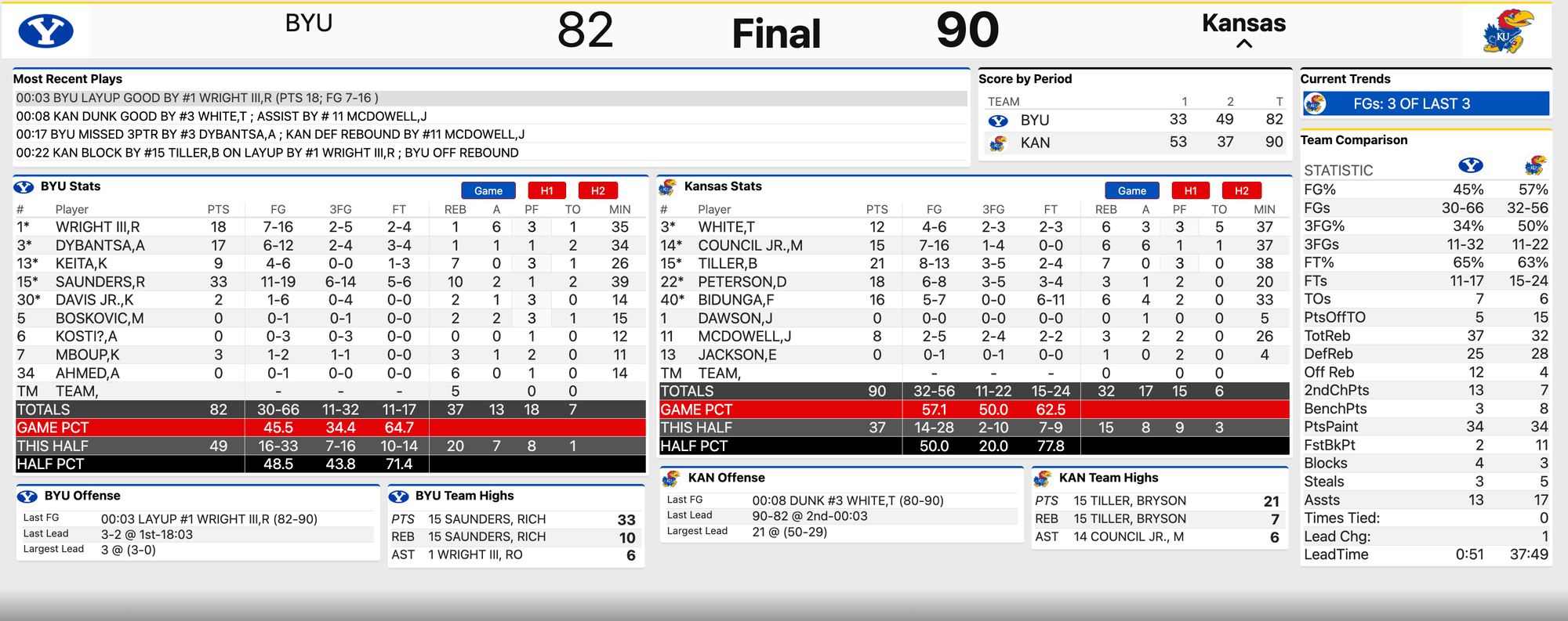 KU led by 21 at one point and 20 at halftime, after scoring 53 in the first half. But the Jayhawks went cold in the second half and BYU got hot, with the Cougars cutting the KU lead all the way to 4 with 1:27 remaining before a big bucket by Melvin Council Jr., ended a tough KU drought and helped the Jayhawks reach the finish line first.