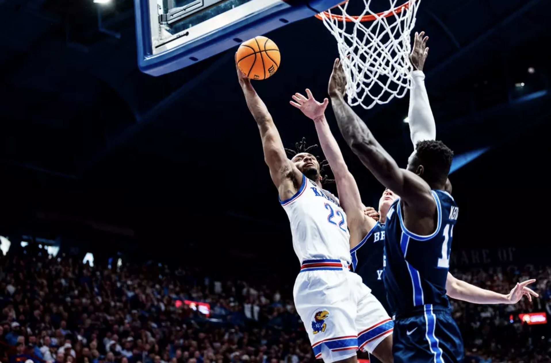 • "Over-rated" chant - He didn't have his best game, but the chants from the KU student section toward Dybantsa that roared, "Over-rated" were a little much. The dude is not overrated. Not even a little bit. He's got everything you want in a basketball player and is still growing his game. He'll be a top 2 or 3 pick in this summer's draft and he'll continue to torture Big 12 teams the rest of the way. Perhaps even Kansas if the two meet again in the Big 12 tourney. Oh, by the way, after the chants, Dybantsa scored 5 straight points on 3 trips for the Cougars to help BYU cut the KU lead down to 13 with 11:18 to play. Dybantsa finished with 17 points in 34 minutes, turning in a solid second half after a quiet first half.