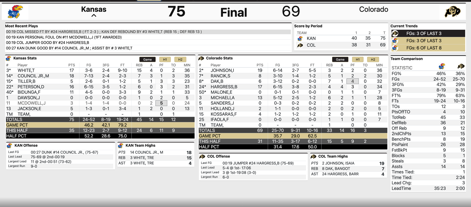 The Buffs cut the KU lead to a single point (60-59) with around 6 minutes to play and then Melvin Council Jr. went wild to give the Jayhawks a new cushion just as quickly as the old one disappeared.