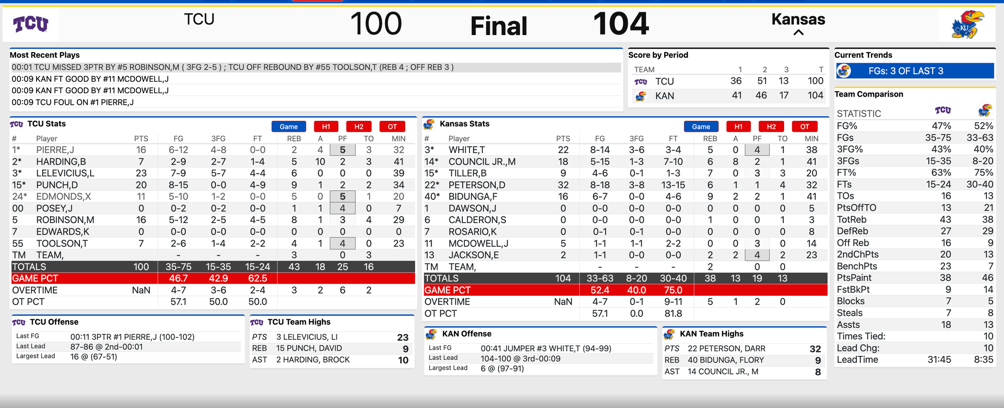 The Jayhawks did most of the heavy lifting in their comeback with star freshman Darryn Peterson on the bench. Peterson exited with 2:25 to play after scoring 29 points because, according to KU coach Bill Self, he started cramping or felt the cramps coming on. He had played 32 minutes up to that point but mustered the ability to play the final 5 of regulation, when KU had a chance to tie the game with a late 3-pointer after a TCU turnover forced by Elmarko Jackson on an inbounds pass.