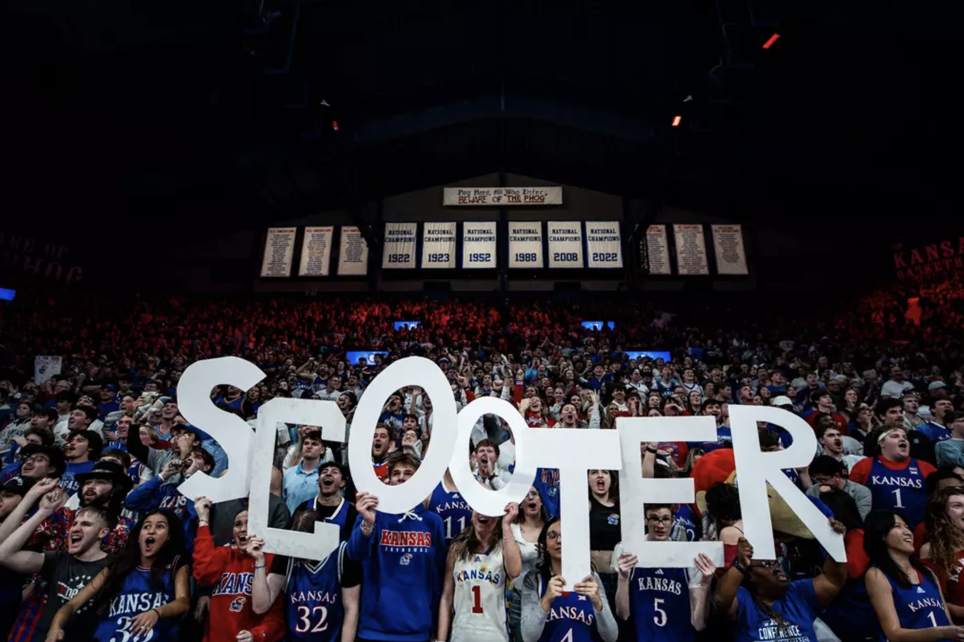 • Beautiful 'Scooter' tributes - There were several nice tributes to the late Scott "Scooter" Ward, who passed away on Saturday at the age of 59. Ward, the longtime KU academic adviser, who was known for his positivity and friend-to-everyone persona, was honored with a moment of silence before the game and an "SW" patch on the Jayhawks' jerseys. Beyond that, there was a video montage of classic Scooter photos shown on the video board and a No. 1 blue Kansas jersey stretched out over a chair near the KU bench, where Scooter often sat during KU home games. All of those were great and clearly meant a lot to a lot of people in the building on Tuesday night, but, by far the most impactful tribute came when his wife, Robin, and mother, along with a team of Scooter's doctors and caretakers were introduced to the Allen Fieldhouse crowd during the game's first television timeout. As Scooter would've wanted, the emotional moment was greeted by big smiles and loud applause, including from those being introduced. This won't be the last time he's honored and remembered inside Allen Fieldhouse, but it was a pretty memorable first time. After the game, Self mentioned Scooter again, saying he couldn't help but think that KU's No. 1 fan of the last quarter century was looking down on the team tonight to help will them to this win.
