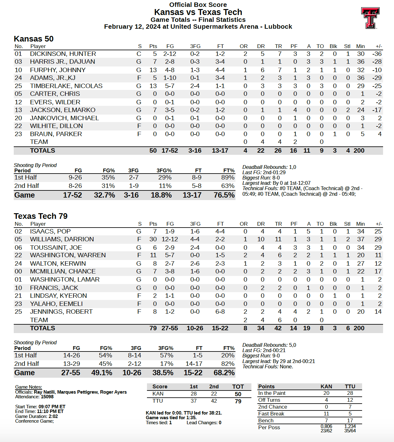 Lubbock, Texas — The 6th-ranked Kansas men's basketball team dropped another Big 12 game on the road on Monday night, falling to Texas Tech, 79-50, at United Supermarkets Arena.