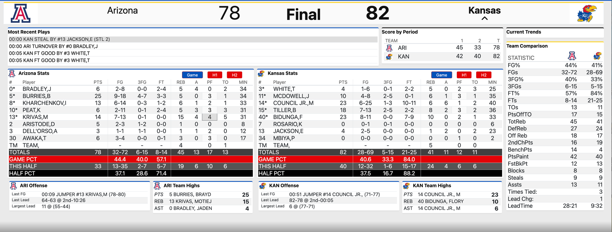 • Flory Messi? - During a scrum under the Arizona basket after a Wildcats' miss midway through the 2nd half, KU big man Flory Bidunga sat on his butt and seemed to flip the ball up into the air with one of his feet. That allowed the Jayhawks to gain to control and push the ball up the floor for another transition basket that cut the Arizona lead to 62-58 with around 12 minutes to play. U of A coach Tommy Lloyd pleaded with the officials for the kick call but it never came. Wild sequence. Heady play by Bidunga.