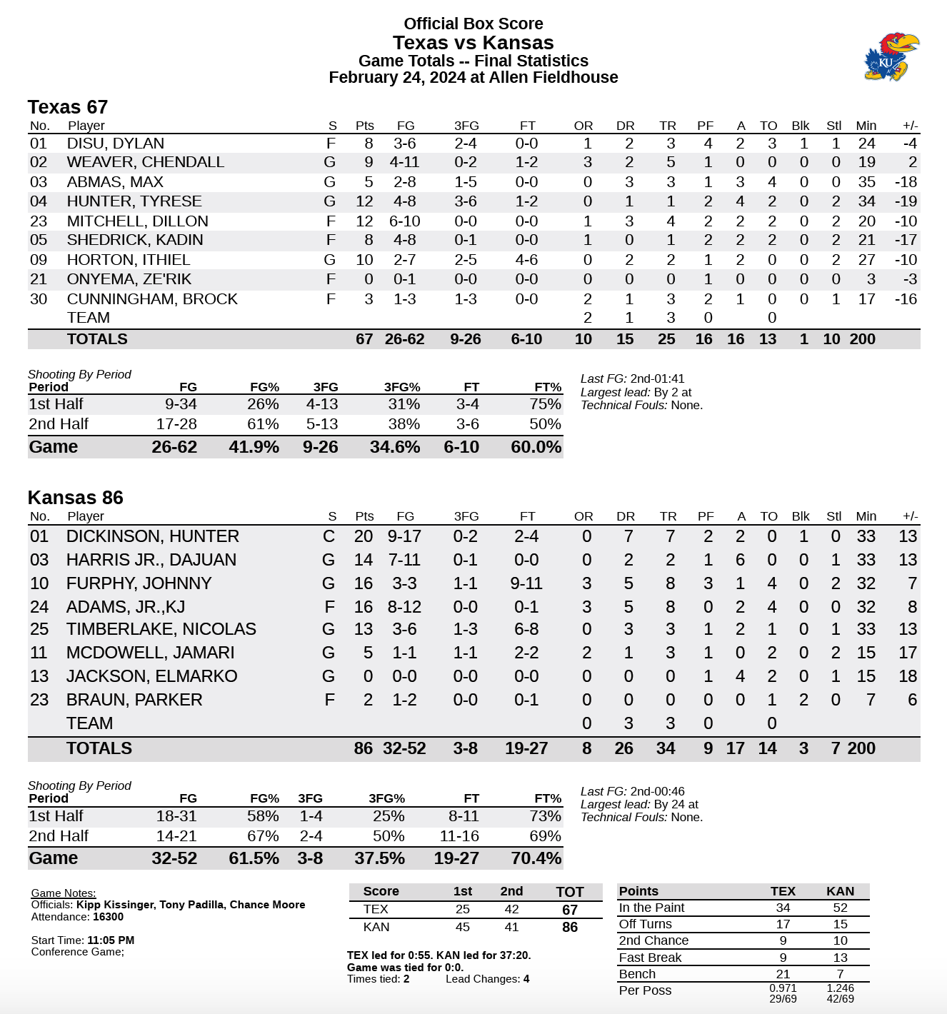 — Kansas Men’s Basketball (@KUHoops) February 24, 2024