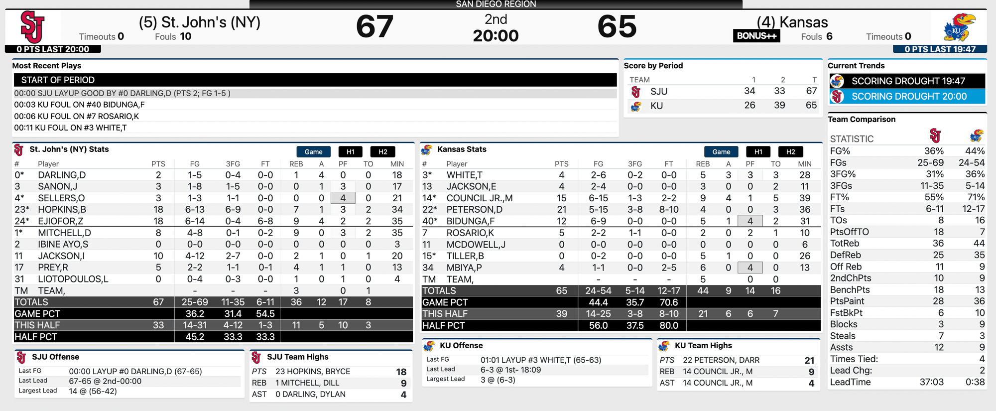 Kansas got off to an awful start, really on both ends of the floor, and then found a way to right the ship, using stingy defense and trash shooting by St. John's midway through the first half to cut the SJU lead to one late in the first half. But the Johnnies closed the half on a 9-2 run and led 34-26 at the break.