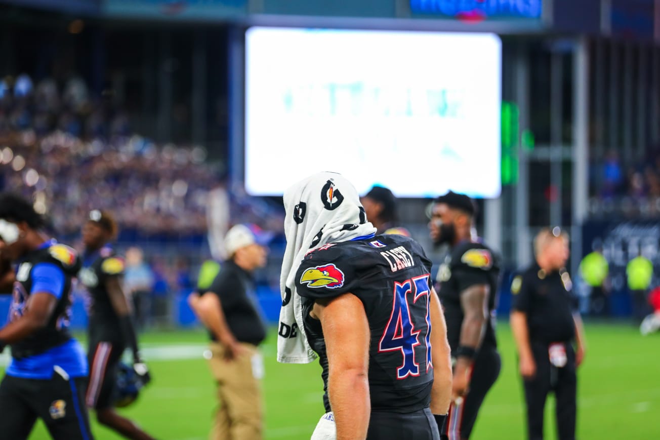 • JD6 uses his legs – It wasn’t the best night for Daniels through the air — again — but he looked pretty darn good when he chose to use his legs. Especially early. Daniels scored on runs of 11 and 33 yards to put Kansas ahead by double digits and showcased his ability in the option run game throughout the night. When his passes started to miss the mark and throwing the ball became an issue, the UNLV defense started to key on the run a little more, which limited Daniels and Neal significantly. But on a key drive that ended with a KU field goal, Daniels made a couple more plays with his legs to get that drive going.