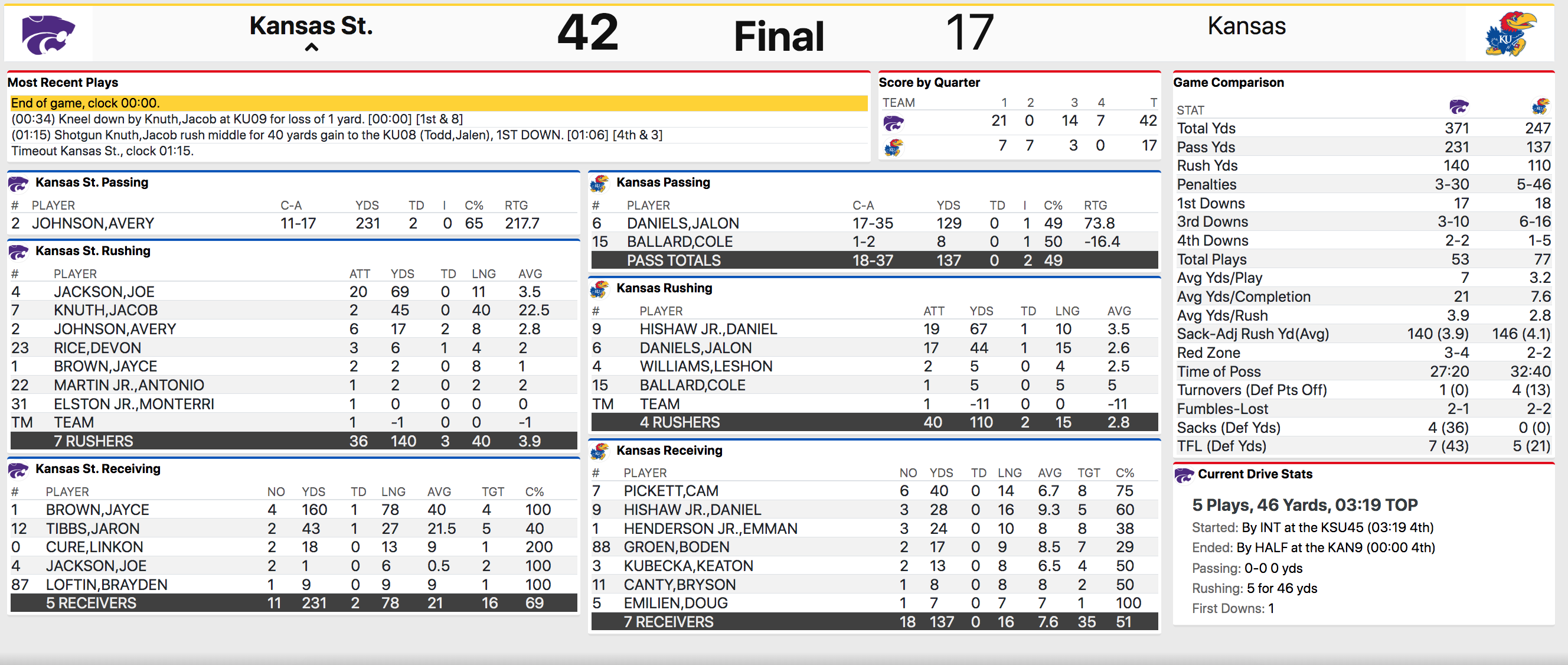 Notes and numbers from KU's 42-17 rivalry loss to Kansas State on Saturday afternoon at David Booth Kansas Memorial Stadium.