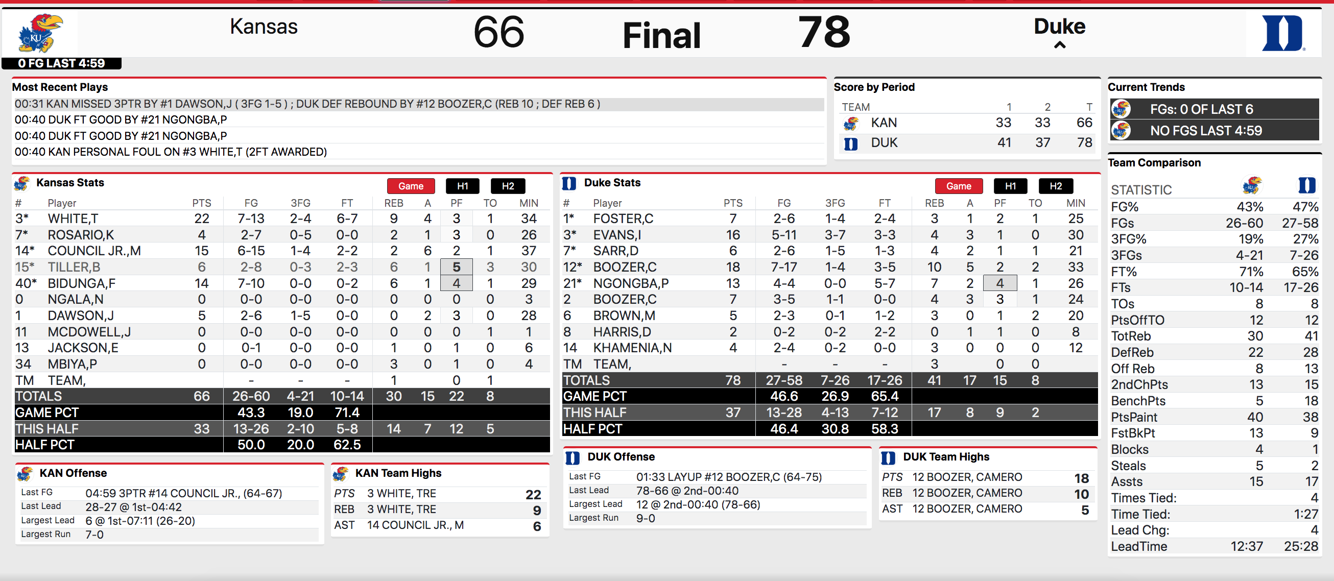 • Makes Bill Self 612-158 while at KU, 819-263 all-time and is 5-5 all-time versus Duke, 5-3 while at Kansas.