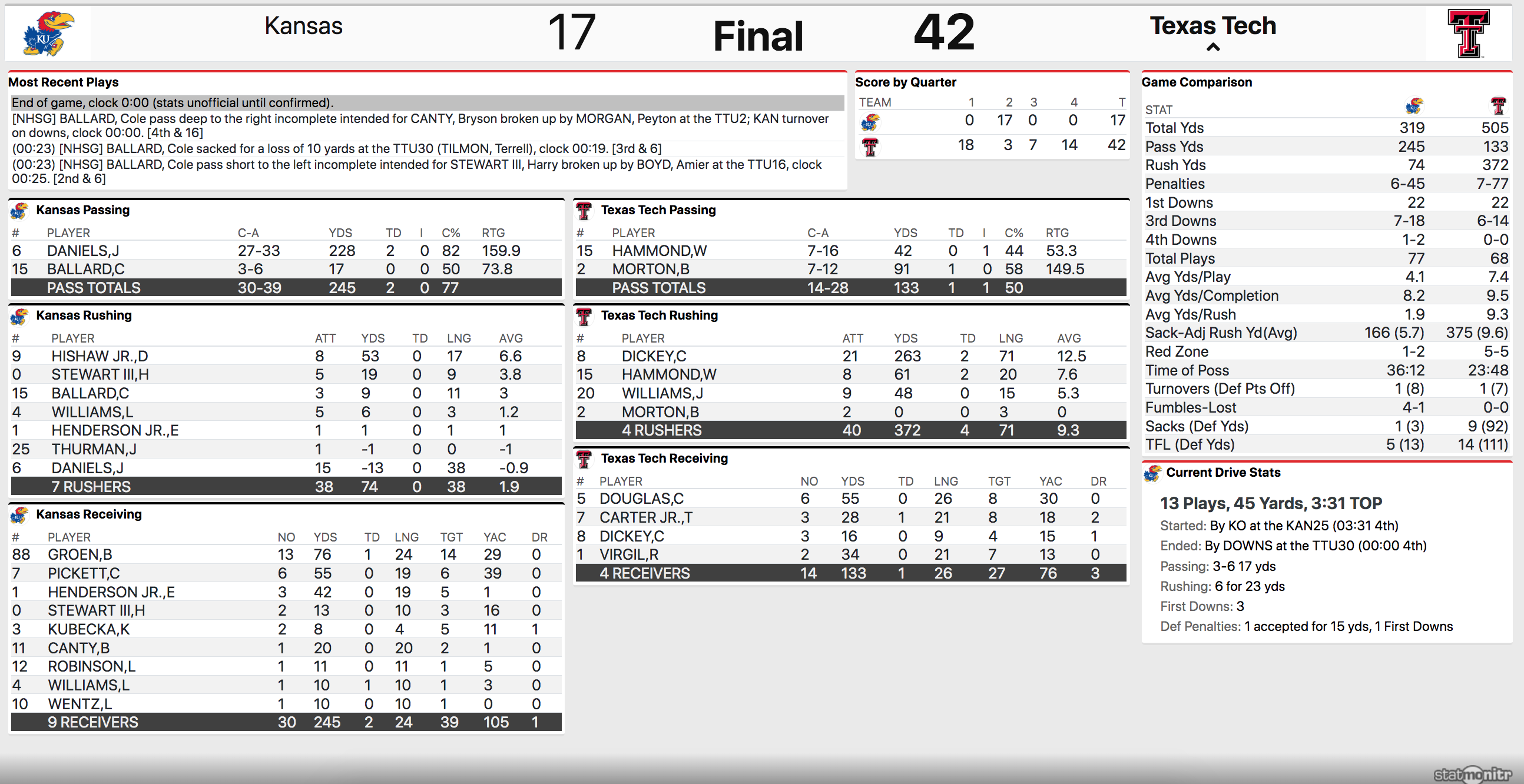 Notes and numbers from KU's 42-17 road loss at No. 9 Texas Tech on Saturday night in Lubbock, Texas.