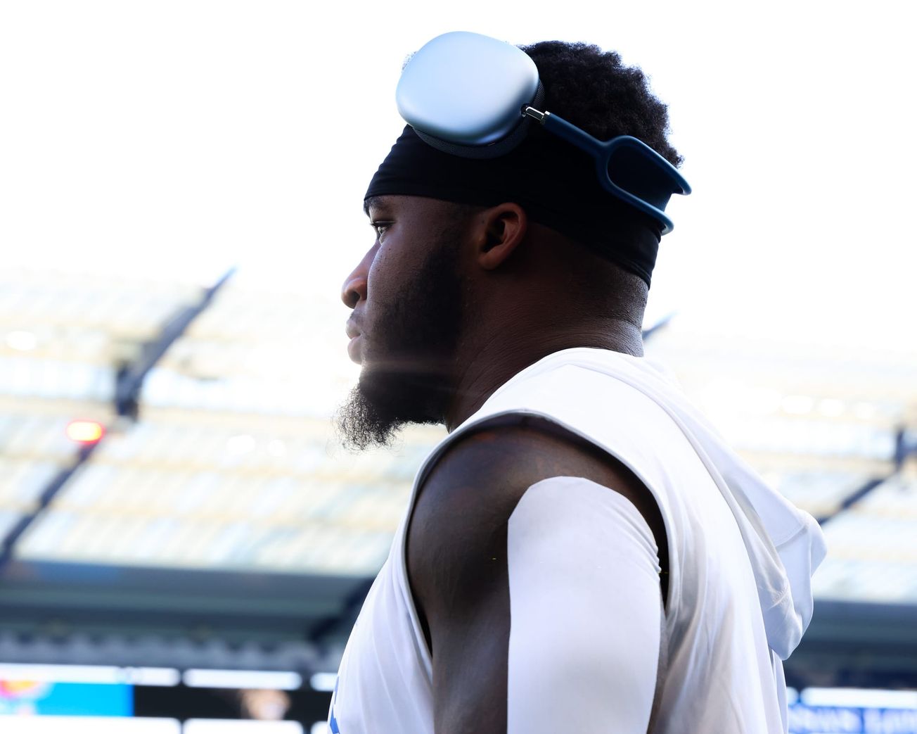 Kansas running back Devin Neal looks across the field during warm-ups of a recent KU home game. [Chance Parker photo]