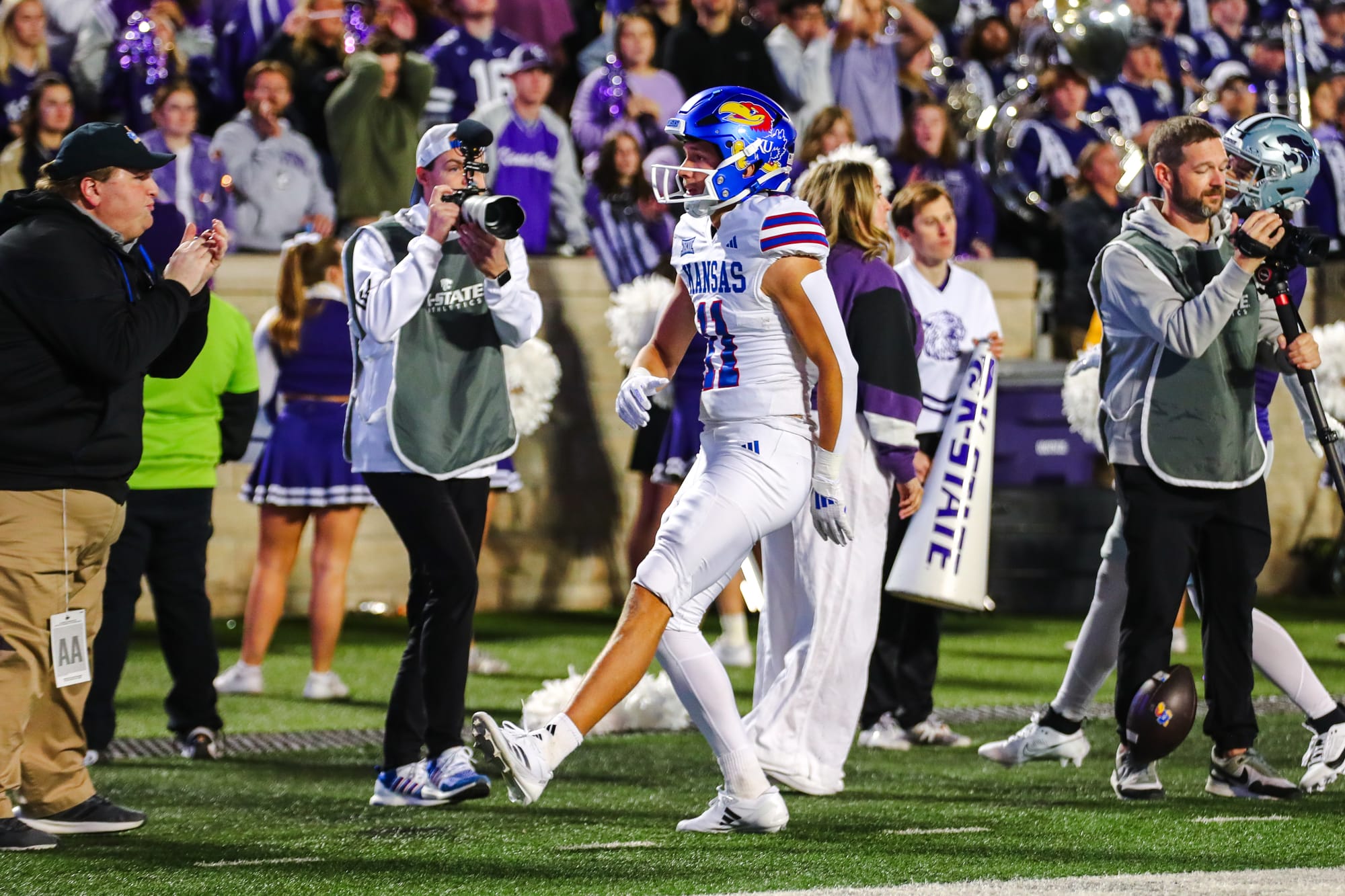 Luke Grimm scores and celebrates his touchdown at K-State last weekend. [Sarah Buchanan photo]