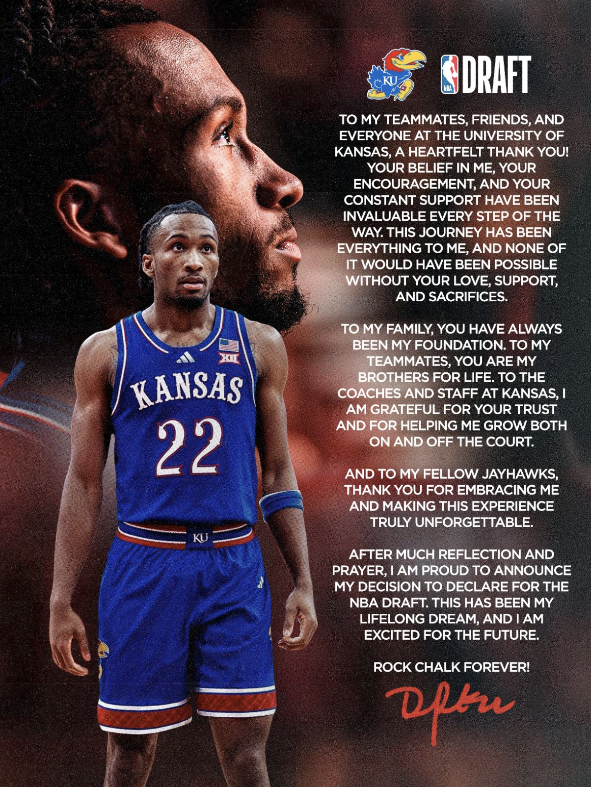 No matter how far from Kansas he gets, the message that accompanied him declaring for the draft talked plenty about his appreciation for Lawrence, KU and being a part of the historic college hoops program.