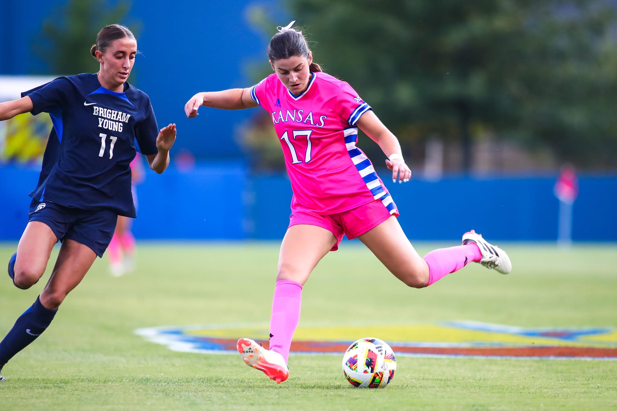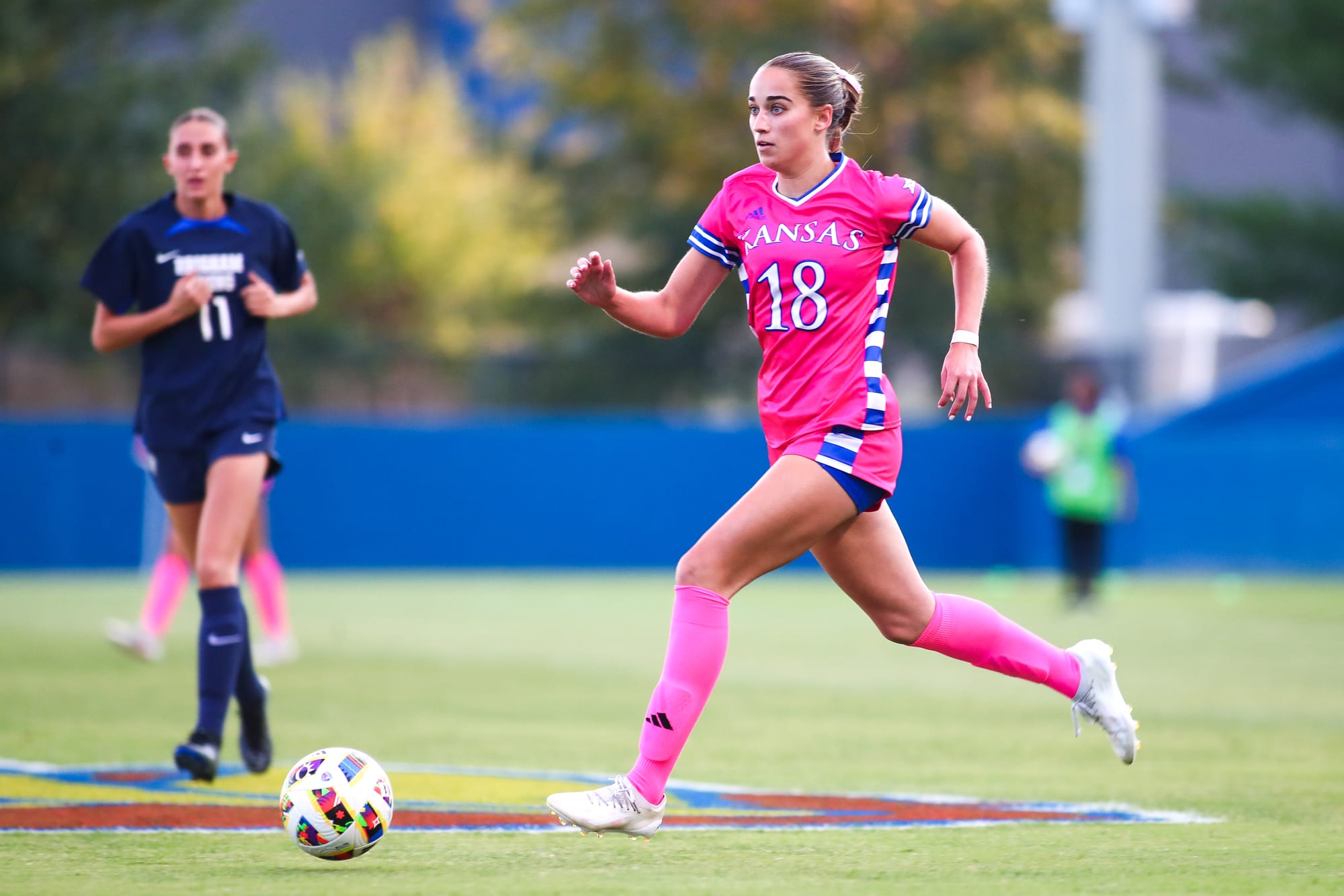 The Kansas women's soccer team scored the only goal of the 2nd half on Thursday night to earn a 2-2 draw with visiting BYU at Rock Chalk Park.