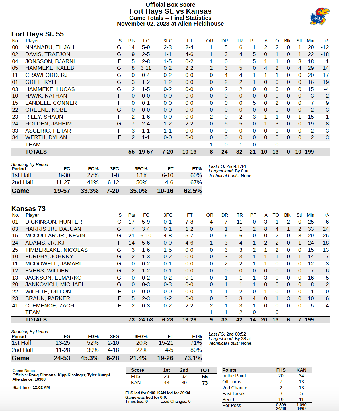 The Kansas men's basketball team knocked off Fort Hays State, 73-55, in the Jayhawks' exhibition finale on Wednesday night at Allen Fieldhouse.