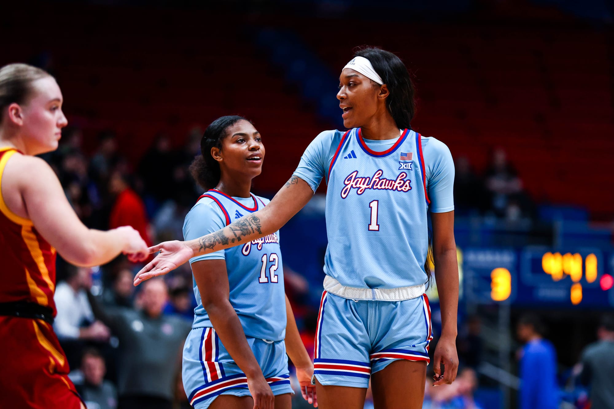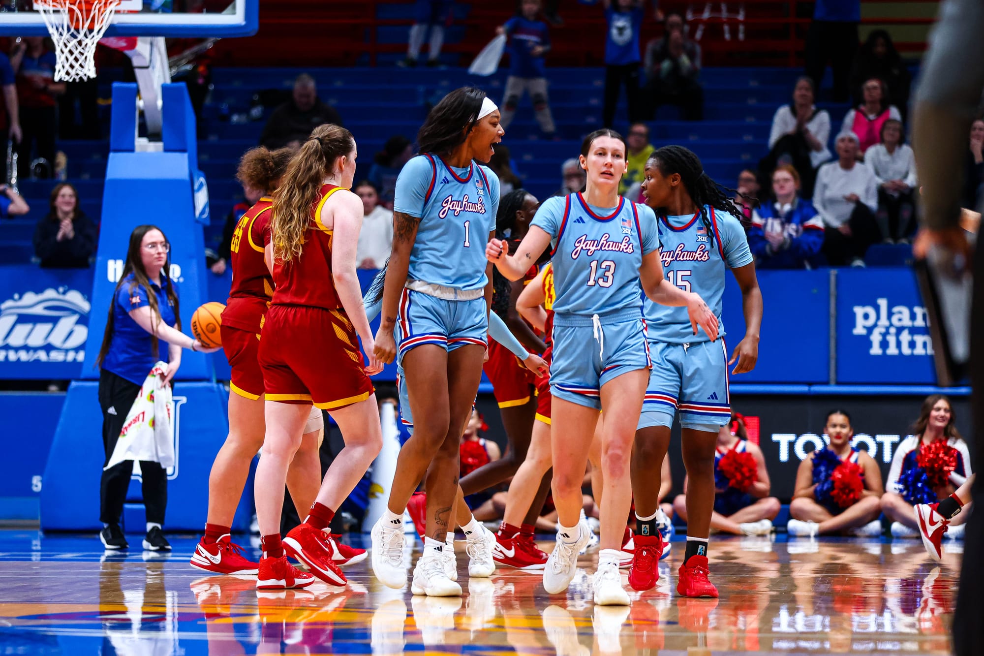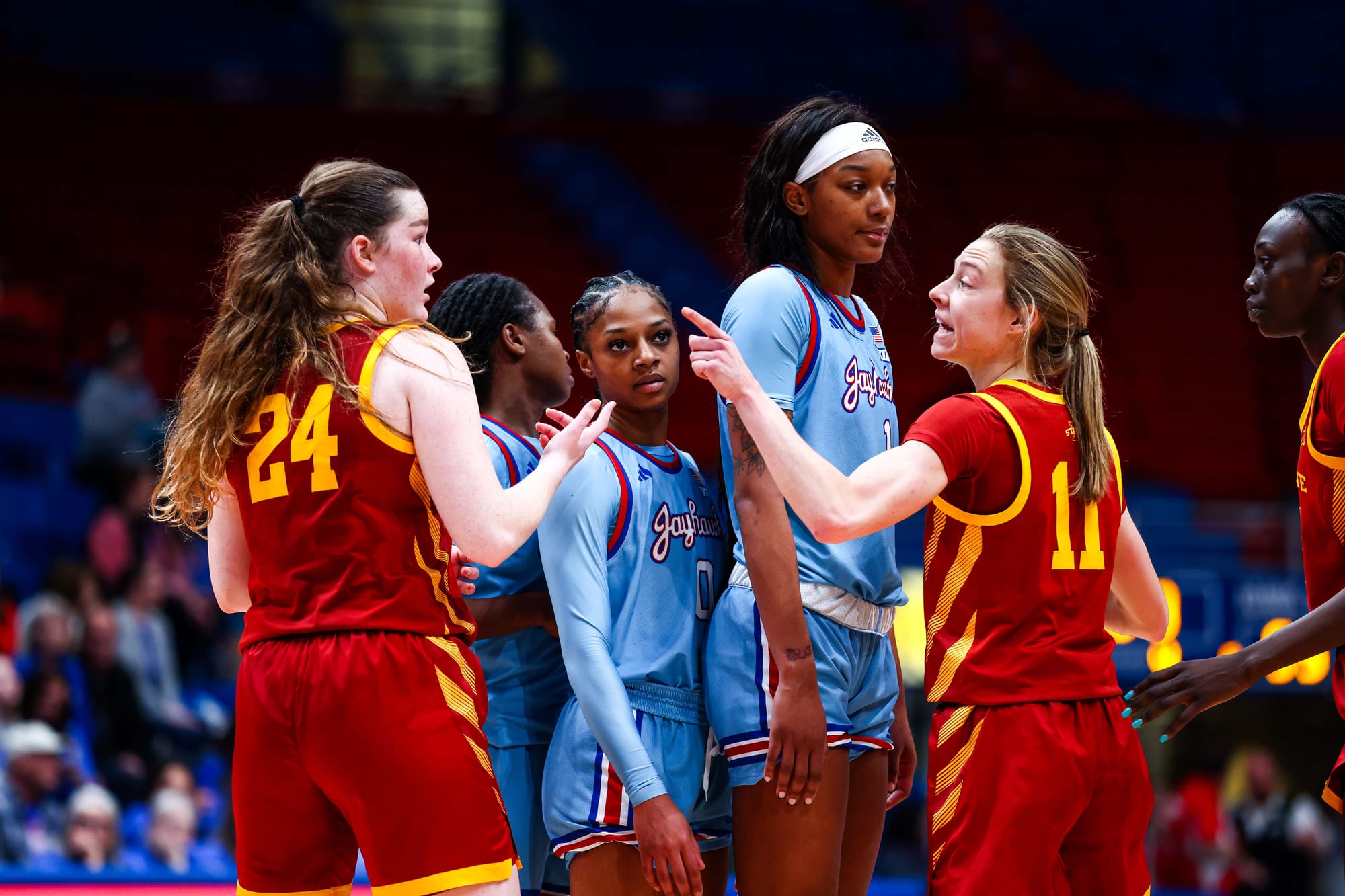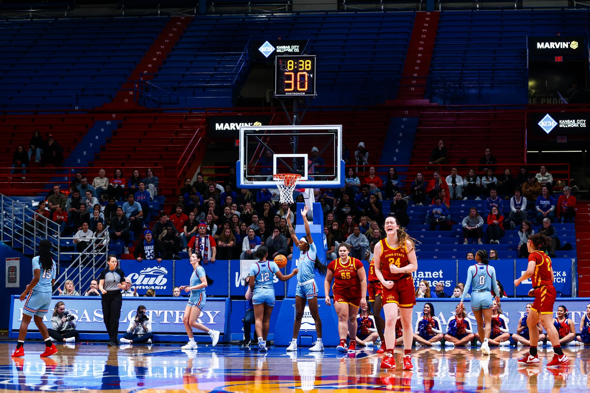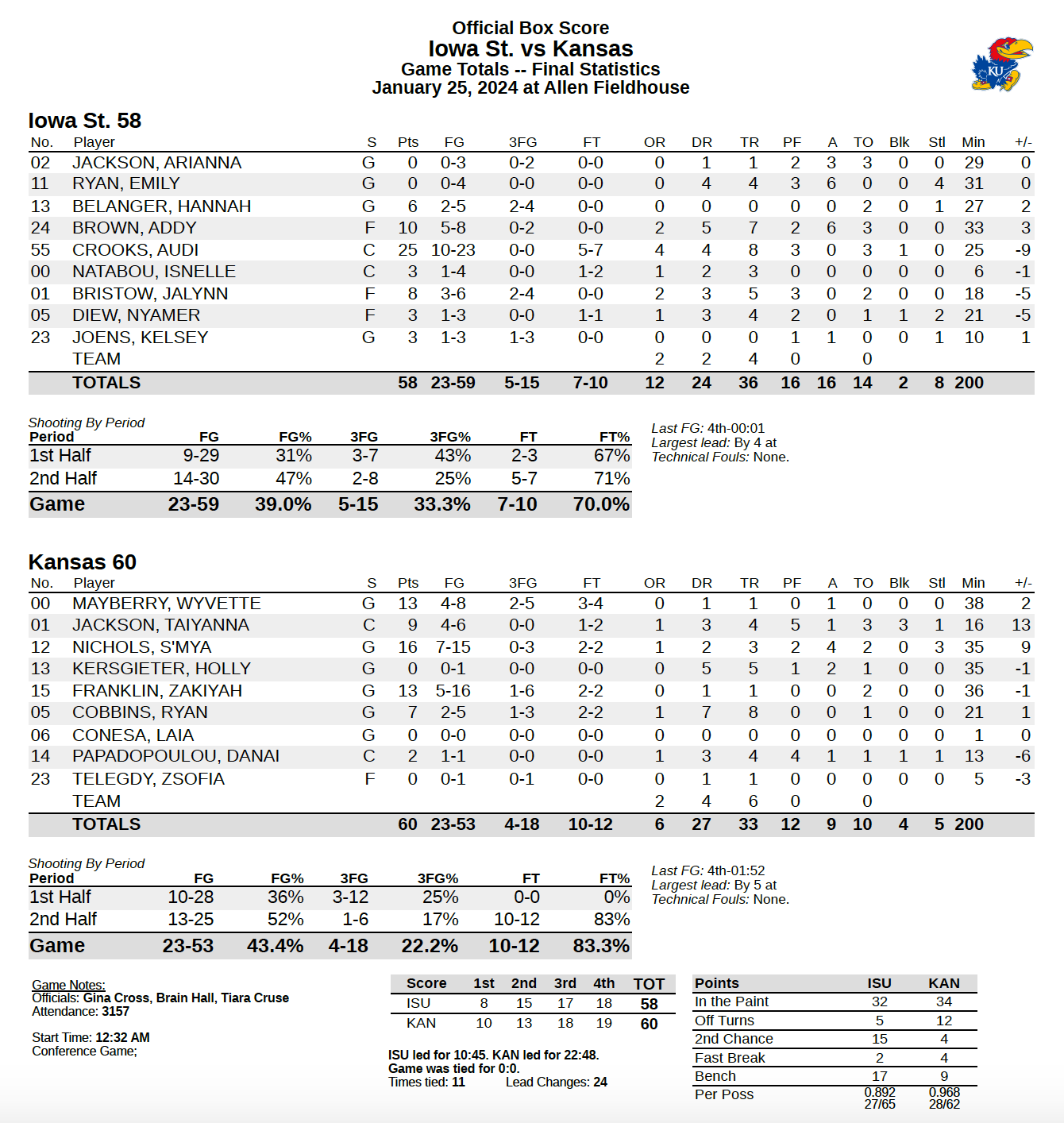 S'Mya Nichols (16), Zakiyah Franklin (13) and Wyvette Mayberry (13) led the KU offense, and the Jayhawks' defense, which KU coach Brandon Schneider called "exceptional" after the win, held ISU to 39% shooting and just 2 fastbreak points. In the first meeting, the Cyclones scored 19 in transition.
