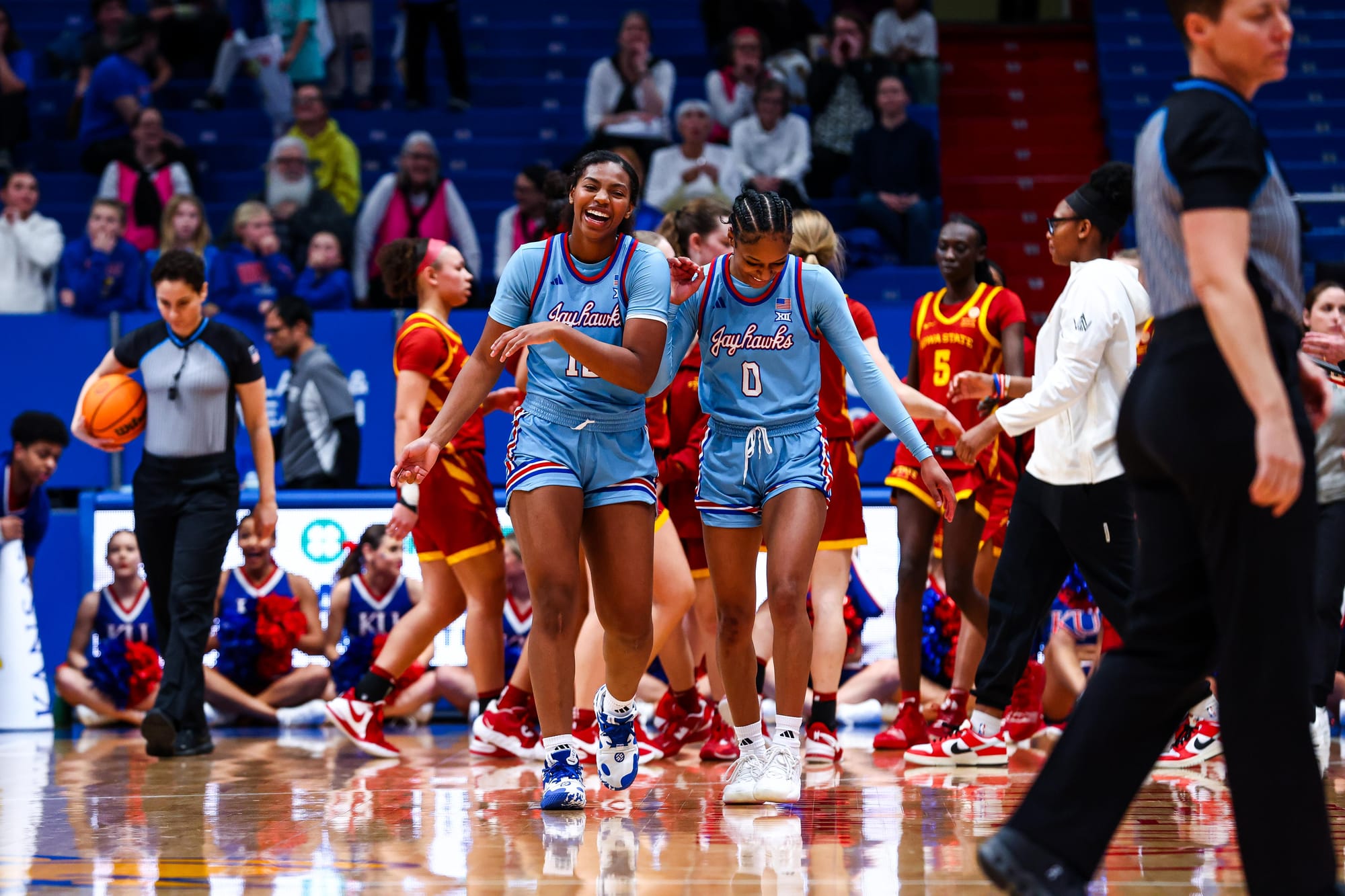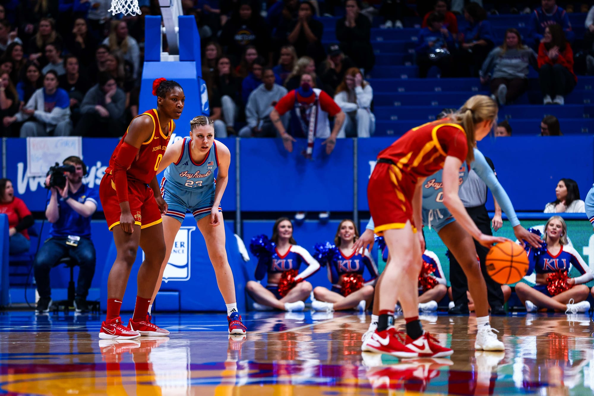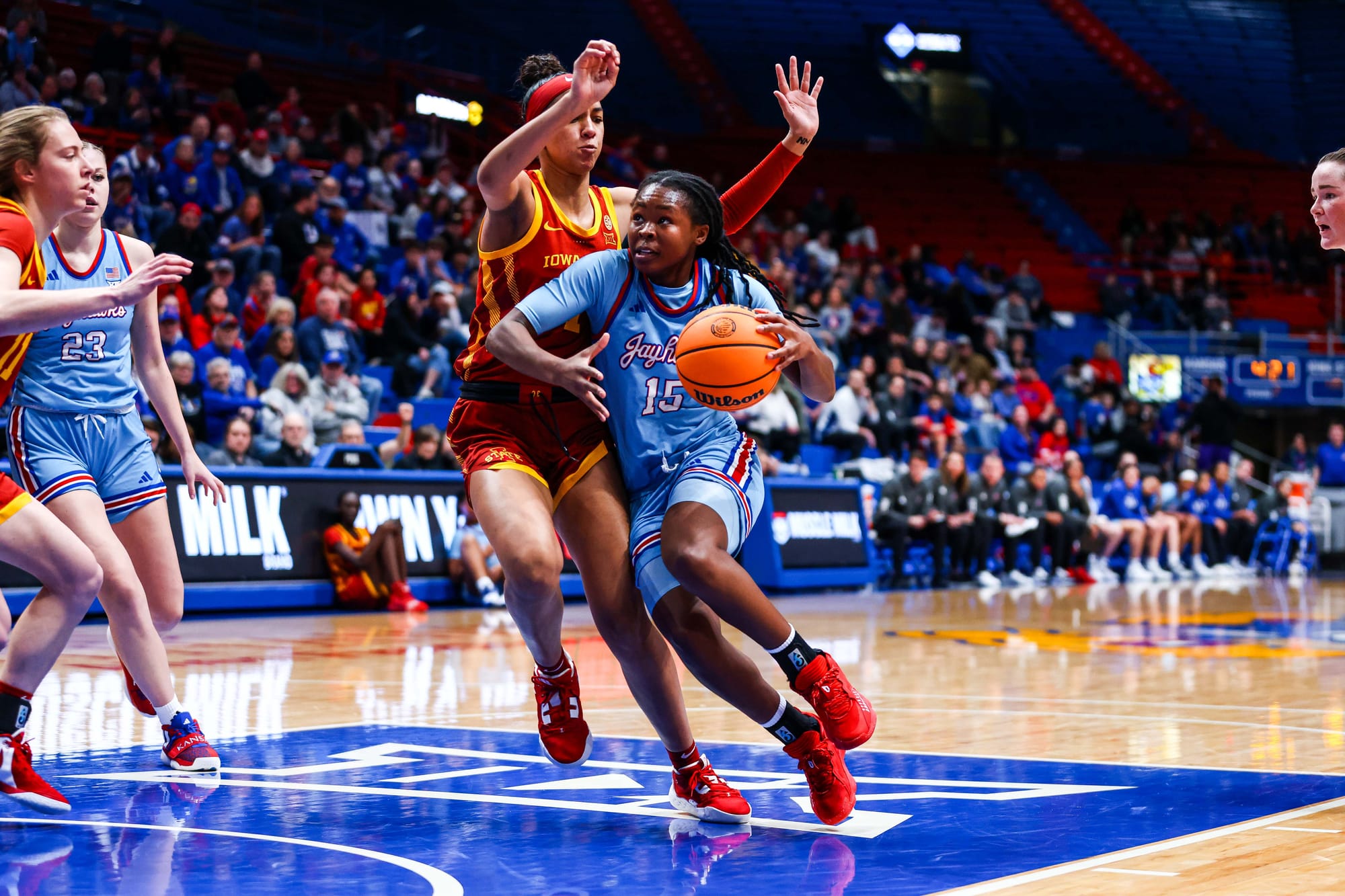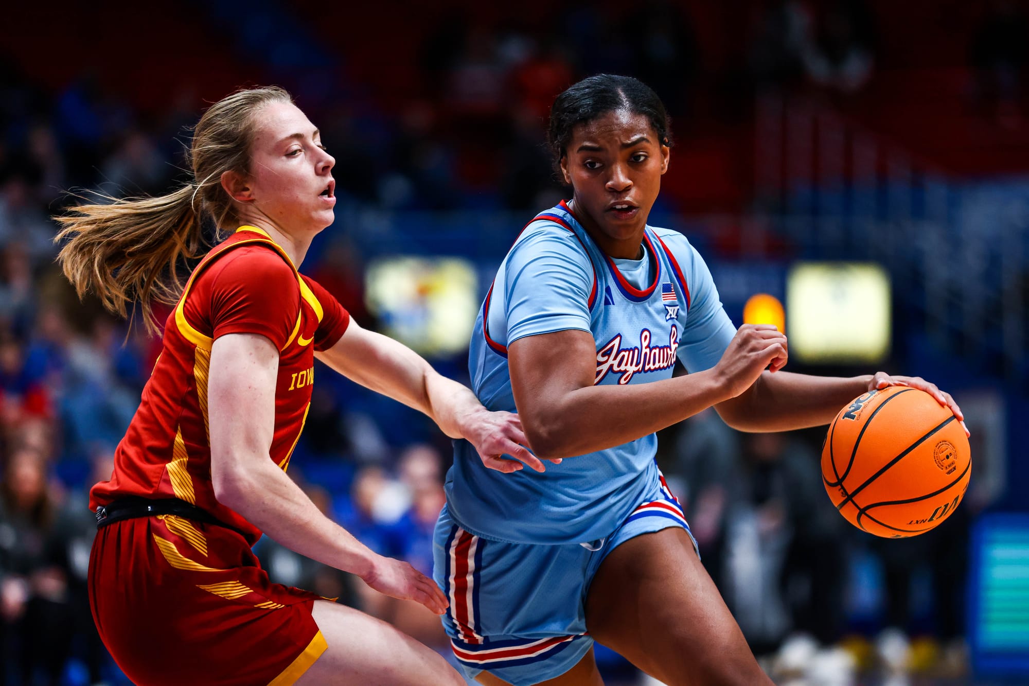 S'Mya Nichols (16), Zakiyah Franklin (13) and Wyvette Mayberry (13) led the KU offense, and the Jayhawks' defense, which KU coach Brandon Schneider called "exceptional" after the win, held ISU to 39% shooting and just 2 fastbreak points. In the first meeting, the Cyclones scored 19 in transition.