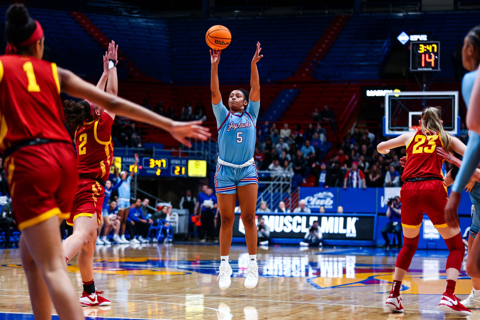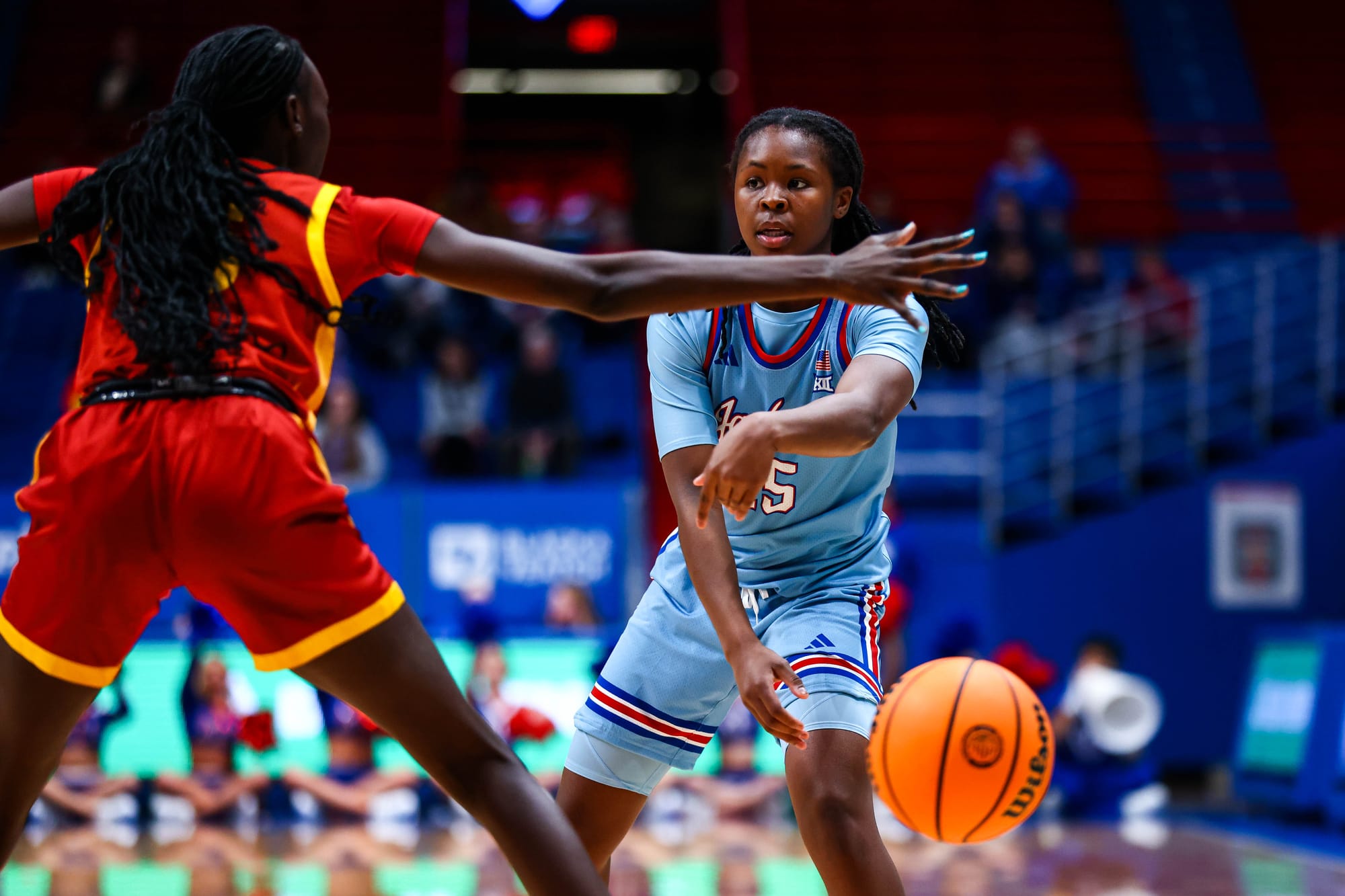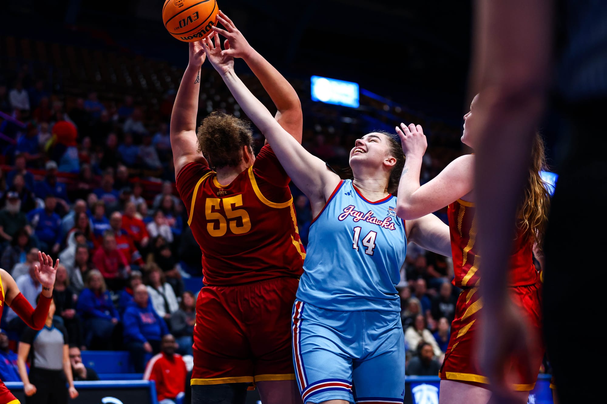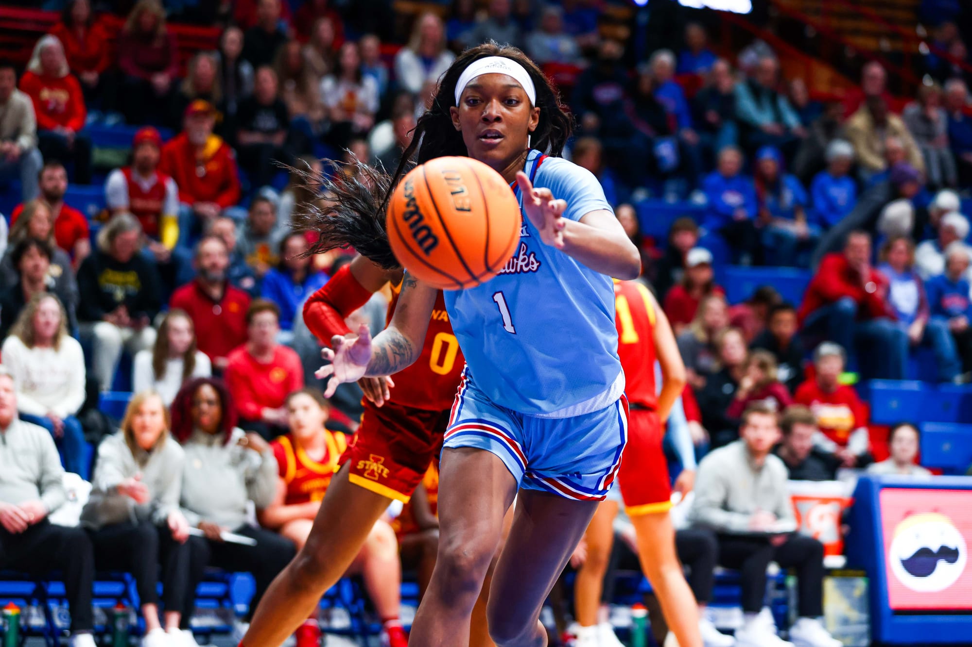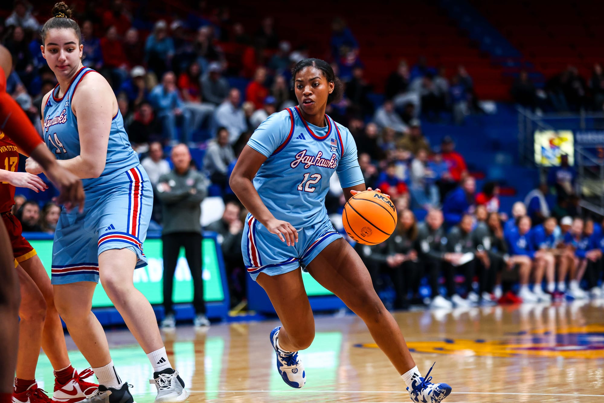 S'Mya Nichols (16), Zakiyah Franklin (13) and Wyvette Mayberry (13) led the KU offense, and the Jayhawks' defense, which KU coach Brandon Schneider called "exceptional" after the win, held ISU to 39% shooting and just 2 fastbreak points. In the first meeting, the Cyclones scored 19 in transition.