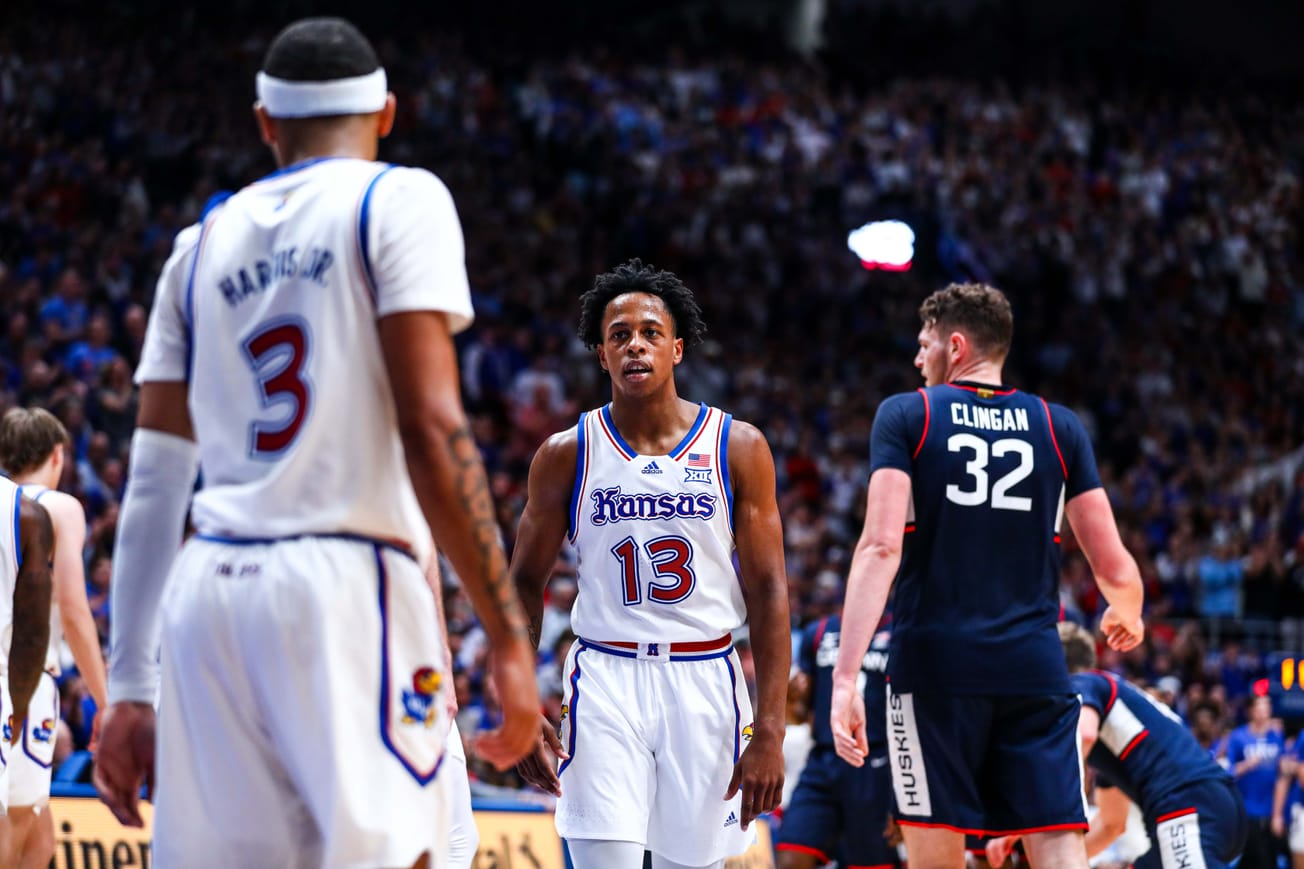 Kansas guard Elmarko Jackson looks to teammate Dajuan Harris Jr. for input during the Jayhawks home win over UConn on Dec. 1 at Allen Fieldhouse. [Chance Parker photo]