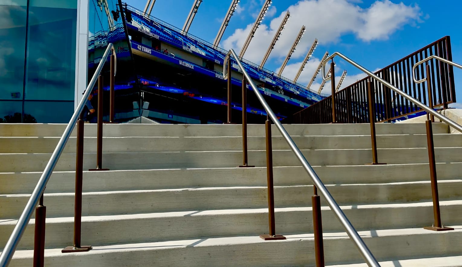 At left, the KU players make their way down the hill and into the new stadium for the first time on game day. At right, the view up the stairs that lead to the concourse level from the southwest gates. [R1S1 Sports photos]